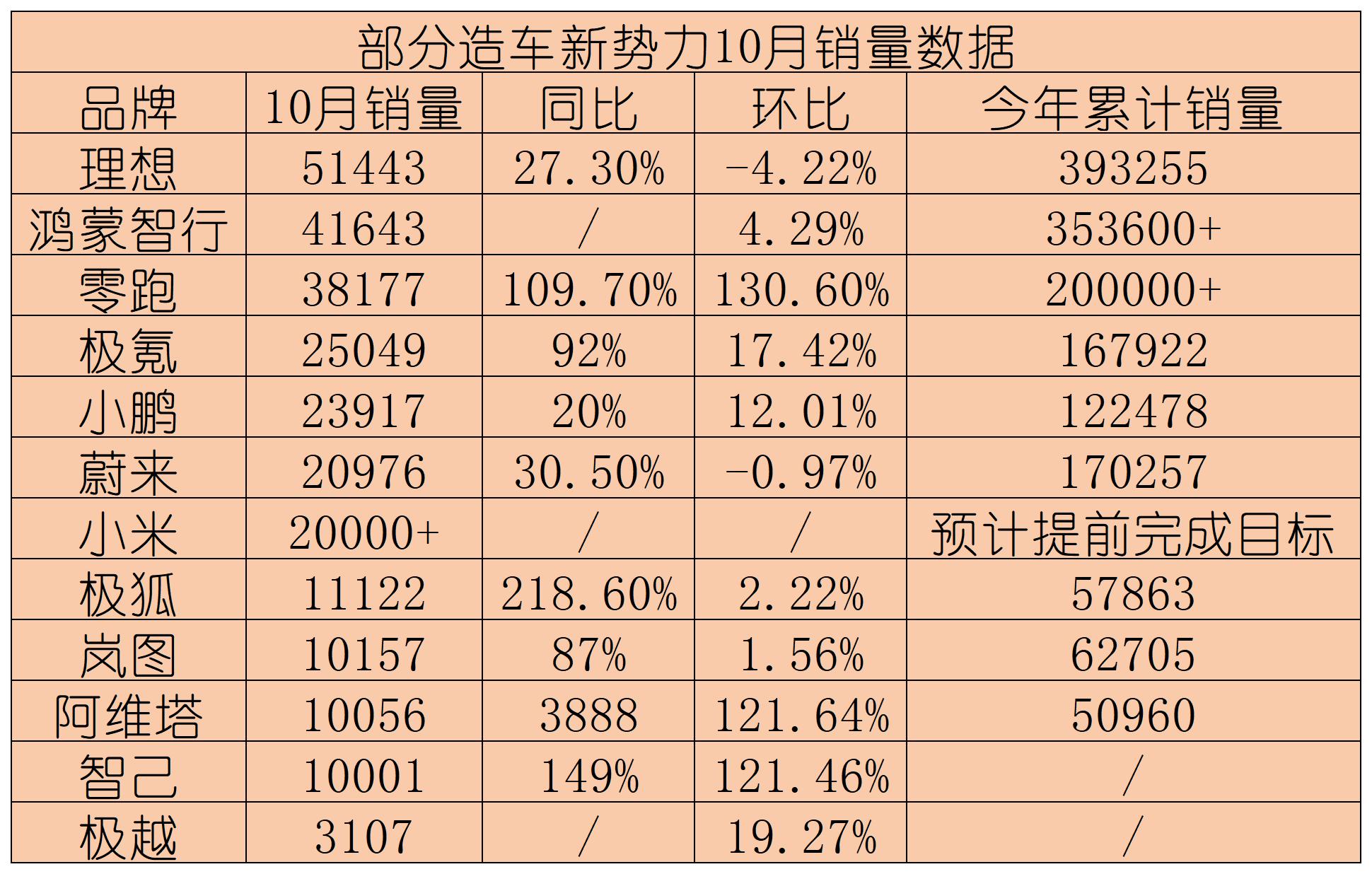 随着国家发改委、财政部印发的《关于加力支持大规模设备更新和消费品以旧换新的若干措施》对购车需求的进一步释放,国内新能源汽车市场迎来爆发。10月份,包括零跑、小鹏、极氪、小米、阿维塔和极狐等多个新势力品牌交付量迎来历史新高。