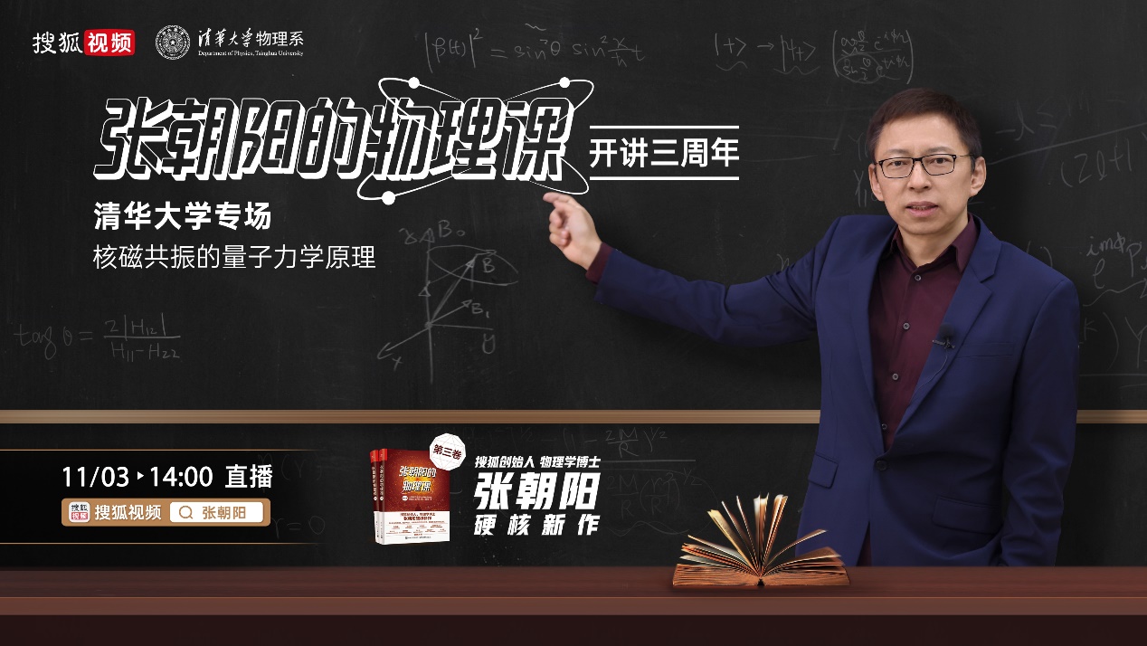 《张朝阳的物理课》迎来开播三周年!11月3日14:00,搜狐创始人、董事局主席兼首席执行官、物理学博士张朝阳将携新作《张朝阳的物理课》第三卷(量子力学)现身清华大学演讲,围绕新书亮点内容“核磁共振的量子力学原理”进行硬核推演。届时,在搜狐视频APP搜索“张朝阳”账号即可观看直播。