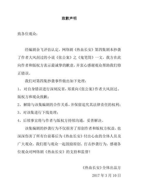 而最近,《热血长安》播出后,同样被不少观众指出第四集《志怪惑人》的故事情节与作者“大风刮过”的作品《张公案》中的《鬼笔筒》极为相似。2月25日,“大风刮过”在微博公开发表质疑,并指出剧中真凶和受害人的姓氏都未做改动,抄袭情节十分明显。