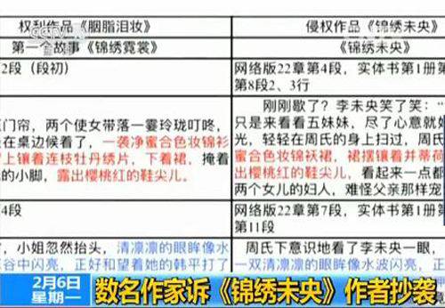 百名网友花了三年时间做出用以对照是否有抄袭情况的“调色盘”,认定《锦绣未央》一共抄了209本书,全书270万字、294章,仅9章未抄。据说,光力证原著涉嫌抄袭的证据就高达1米5!