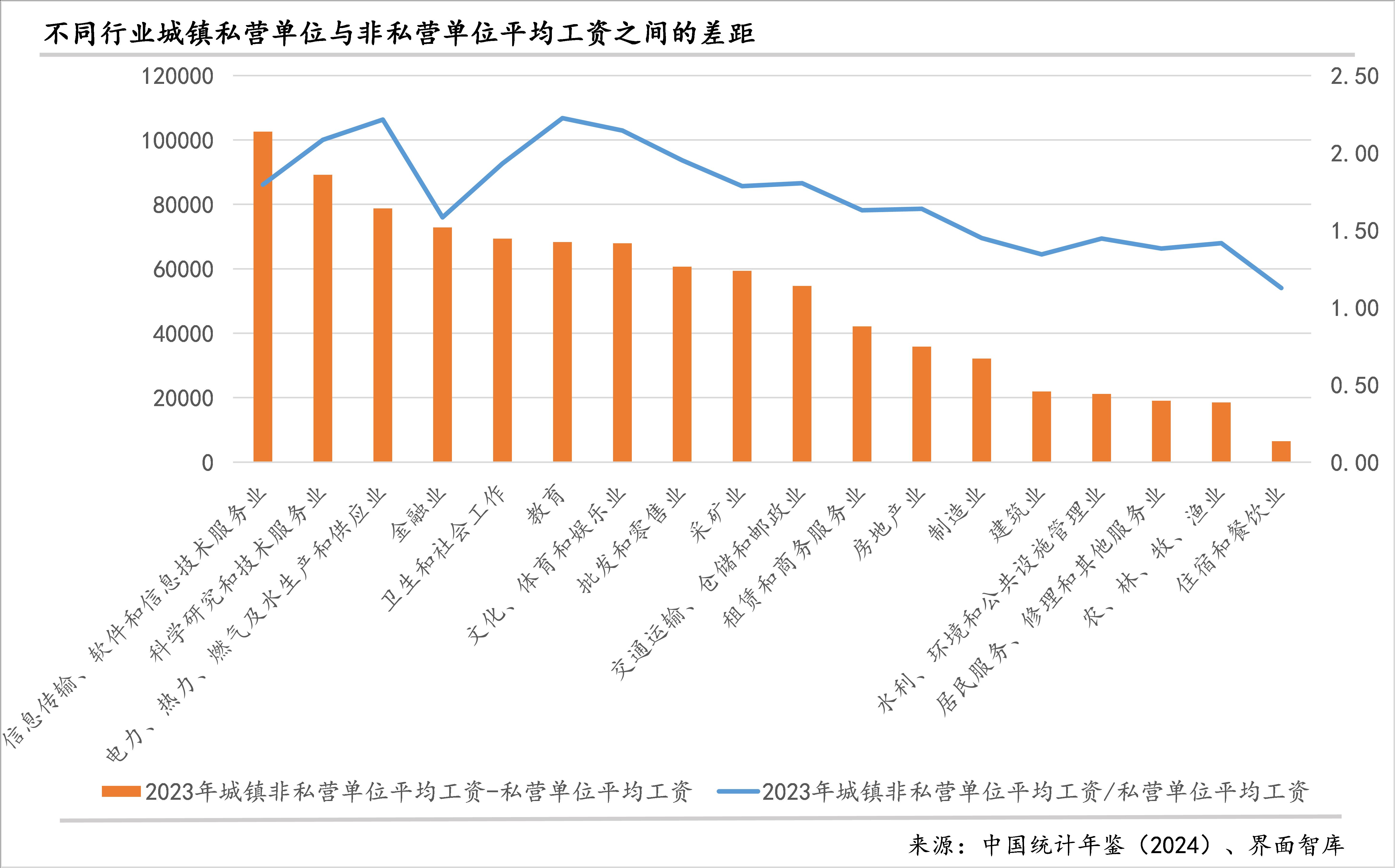 从历史数据来看,有的行业差距在缩小、有的行业则在扩大。比如,科学研究和技术服务业非私营与私营单位的工资差距在扩大,二者倍数与差值都在上升;住宿和餐饮业的非私营与私营单位工资差距则在缩小,二者倍数在下降、差值也较疫情前下了一个台阶;金融业非私营和私营单位工资的相对差距在2019年以来有明显下降,2021-2023年持续稳定在1.58,但绝对差距自2021年以来回升,2023年首次突破7万元。