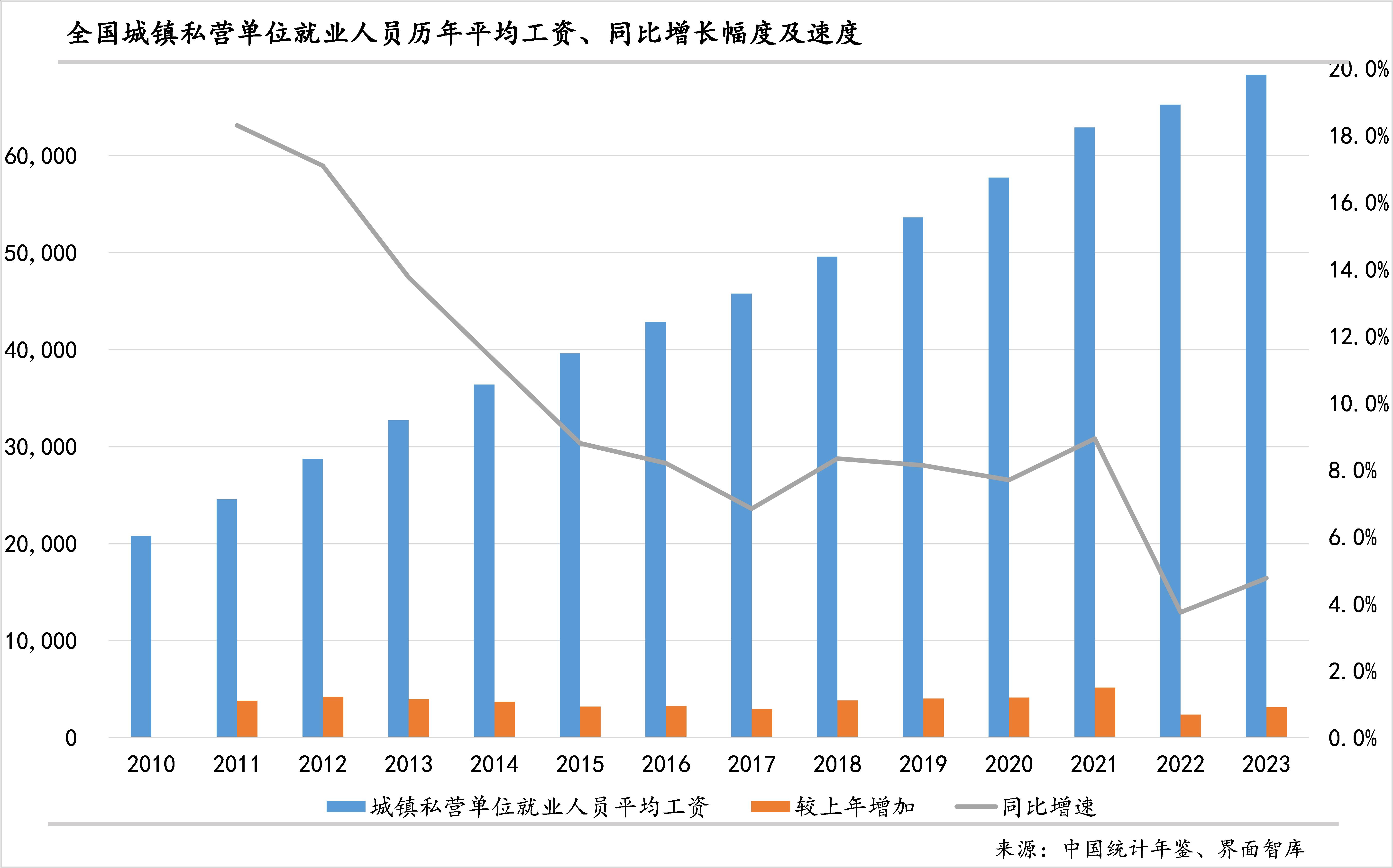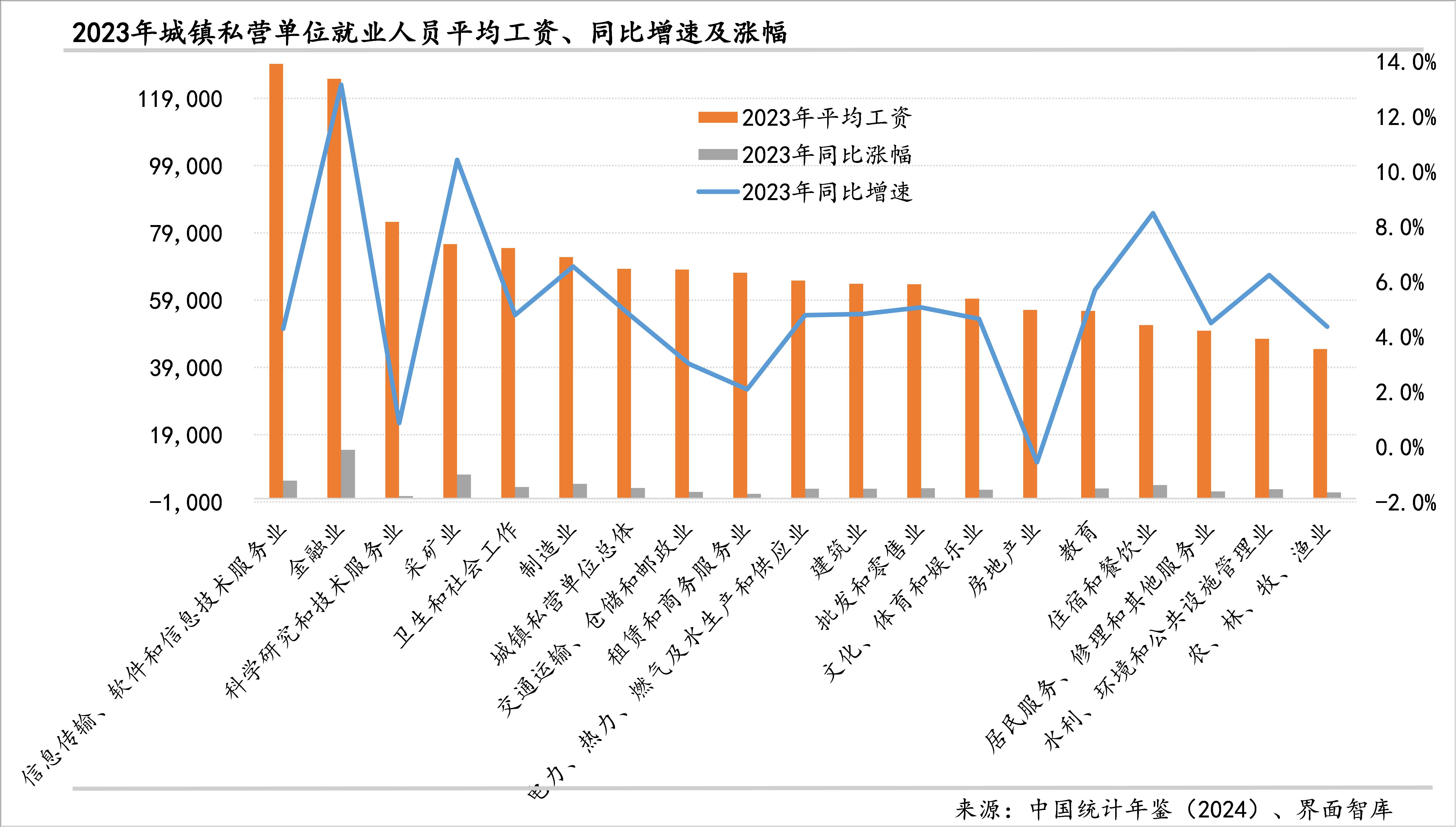 与上年相比,私营单位工资增长最快的行业是金融业,同比增速高达13.2%、增幅为14508元,也是唯一一个增幅过万的行业,金融业已经连续三年实现13%以上的增速;在各行业中,唯一出现下降的是房地产业,2023年减少了316元,同比下降0.6%,较2022年3.2%的降幅有所收窄。 值得注意的是,“科学研究和技术服务业”私营单位工资在2023年仅增长了708元,同比增速从2022年的5%大幅降至0.9%。