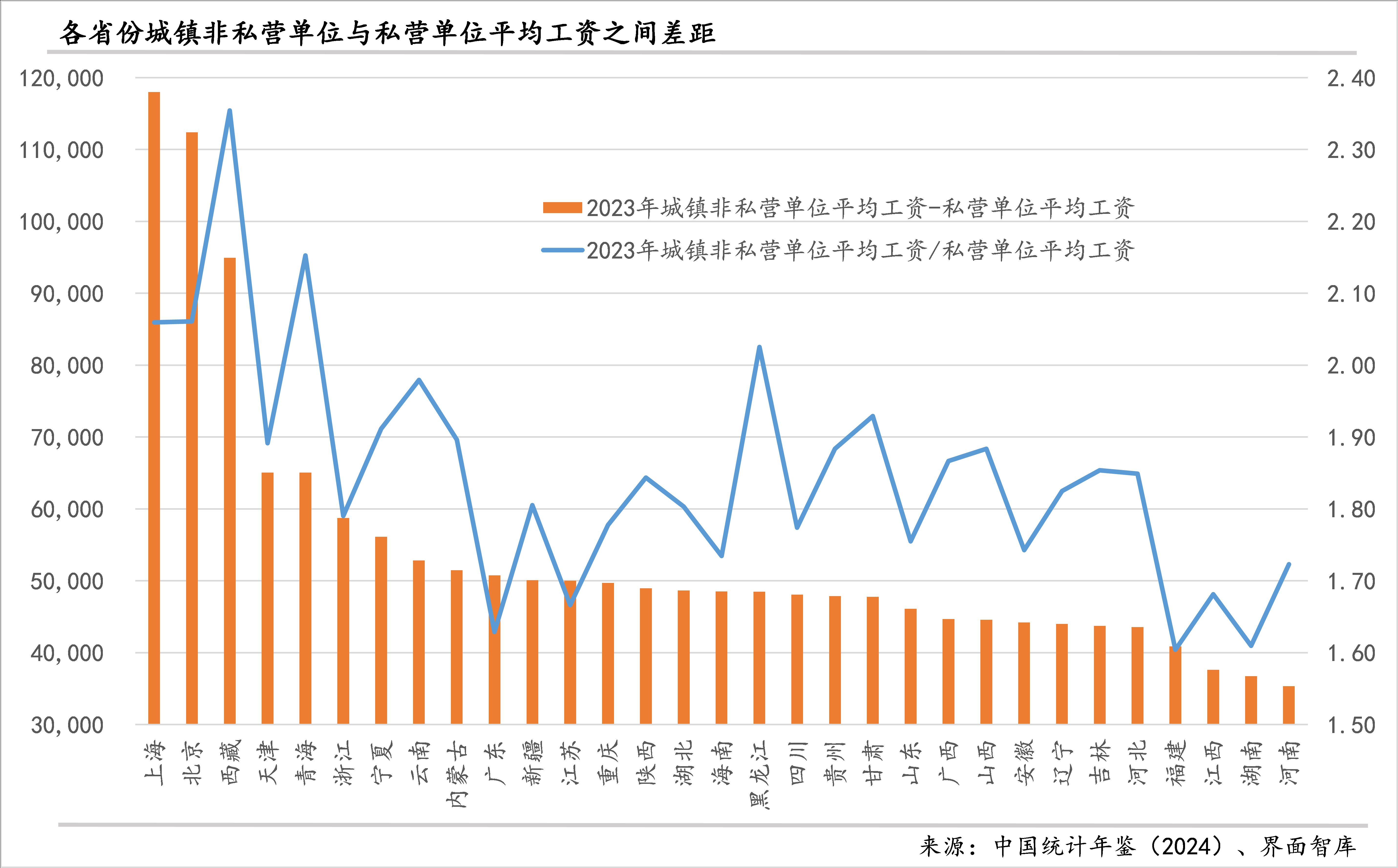 各省份非私营和私营单位的工资差距也有较大差异,江西和湖南等地差距较小。从绝对差距来看,2023年,上海、北京非私营单位工资都超过私营单位11万元;西藏的差值接近10万元;天津、青海的差值都略超6.5万元;浙江、宁夏、云南、内蒙古、广东、新疆的差值则处于5-6万元之间;江西、湖南和河南的差值最小,都不足4万元。