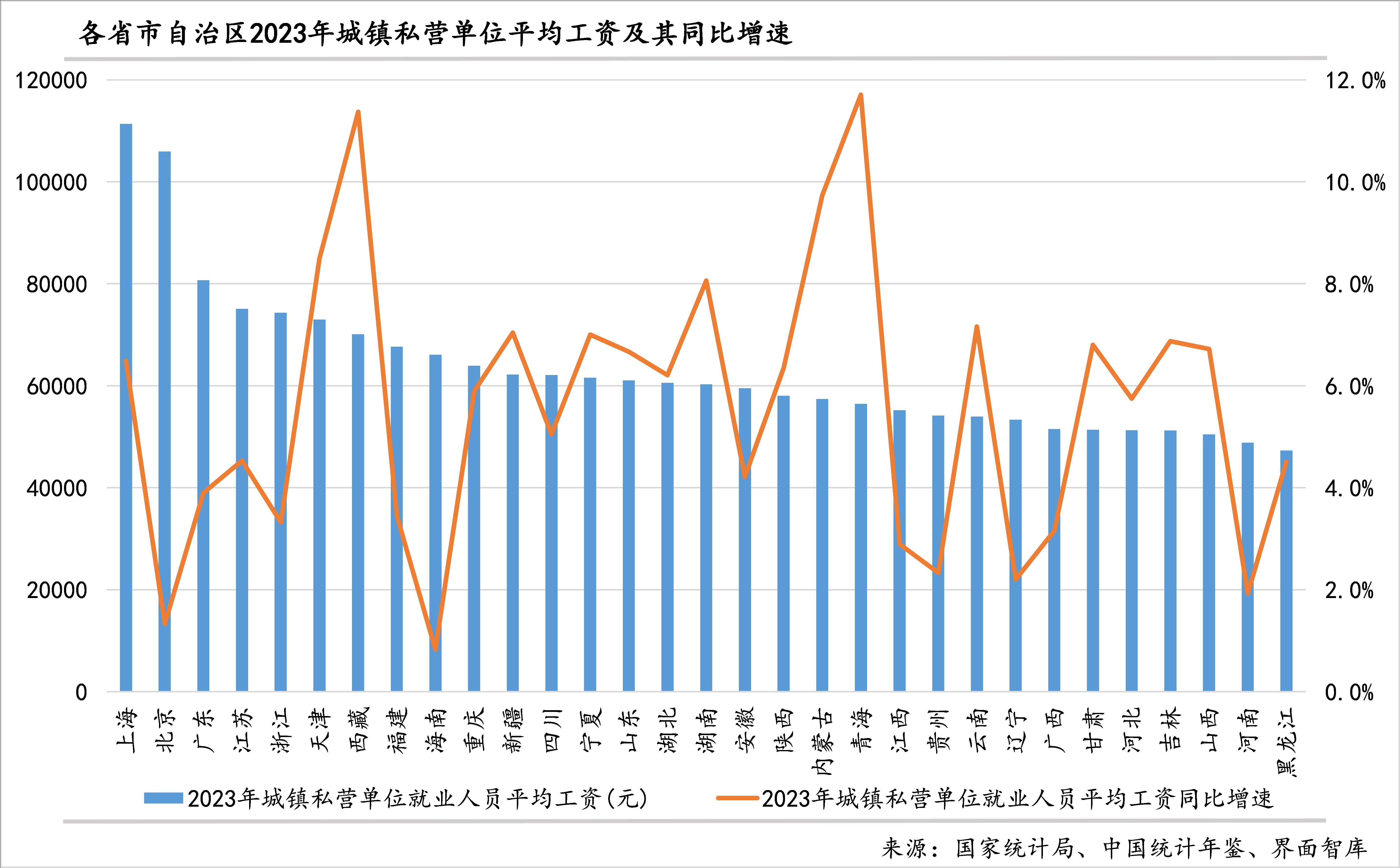 编者按:2024年9月召开的中央政治局会议提出,要帮助企业渡过难关,进一步规范涉企执法、监管行为;要出台民营经济促进法,为非公有制经济发展营造良好环境。继2023年民企大调研之后,界面新闻和界面智库2024年10月起再次开展年度民营企业发展现状调研,以了解民营企业最新发展动态以及政策和法律诉求,助力民企渡过难关(欢迎扫描下图二维码,以匿名方式参与本次调研)。 本文为2024民企大调研系列报道的第三篇,旨在通过最新官方统计数据分析各省份及主要行业城镇私营单位就业人员的平均工资水平。