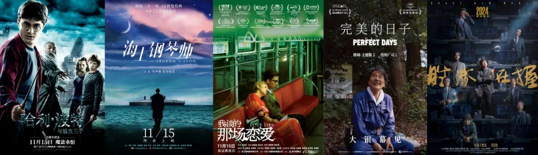 11月15日,《哈利·波特与混血王子》继续;1994年的影史经典《海上钢琴师》又一次重映了;在香港地区连续霸榜的吴君如、邓丽欣新片《我谈的那场恋爱》;奥斯卡、戛纳均入选提名的《完美的日子》,德国导演维姆·文德斯的日本电影;《扬名立万》后,刘循子墨和里八神带着老班底带来的《胜券在握》,试图重现黑马路线……