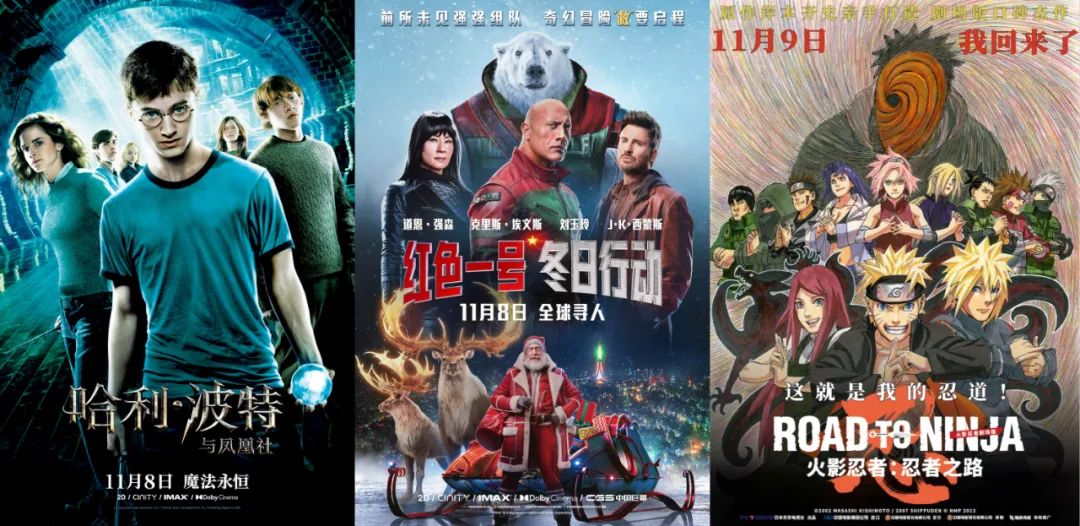 11月8日,《哈利·波特与凤凰社》继续;巨石强森新片《红色一号:冬日行动》在国内提前北美市场一周上映;9日又端上了十二年前的老剧场版《火影忍者剧场版:忍者之路》……