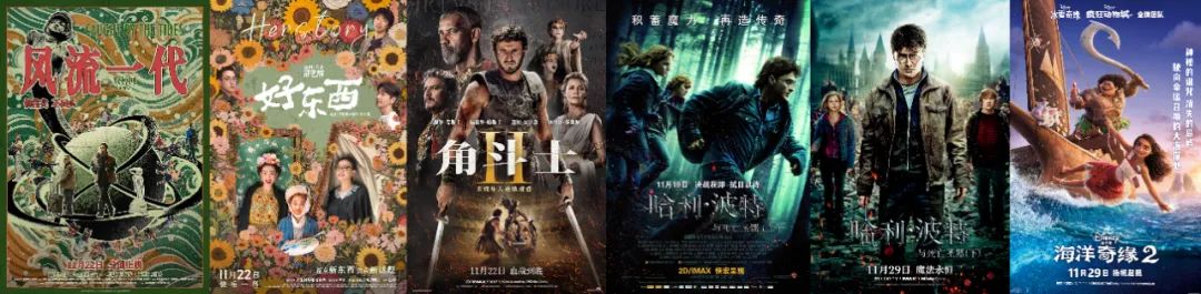 11月22日,贾樟柯新片《风流一代》开始22天的限时上映;邵艺辉在《爱情神话》后的平行篇新作《好东西》来袭;雷德利·斯科特续写奥斯卡最佳影片的《角斗士2》重回罗马史诗时代……月底还有《哈利·波特与死亡圣器》重映圆满进入尾声,迪士尼动画新片《海洋奇缘2》基本同步北美市场上映。