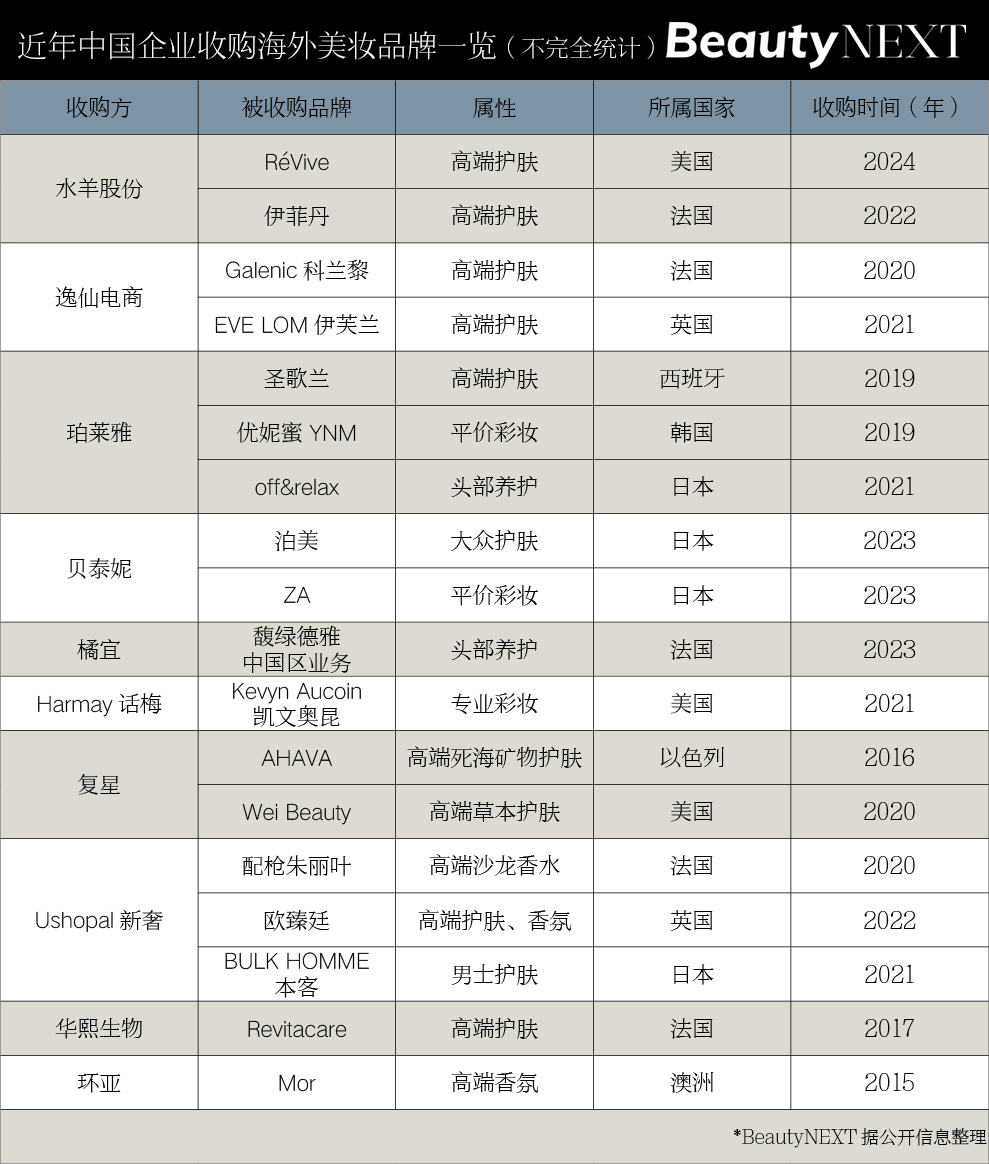 近十年来,国内美妆各个板块的知名企业如逸仙电商、Ushopal、珀莱雅、水羊、复兴、环亚等都投入到投资、收购海外品牌的浪潮中。