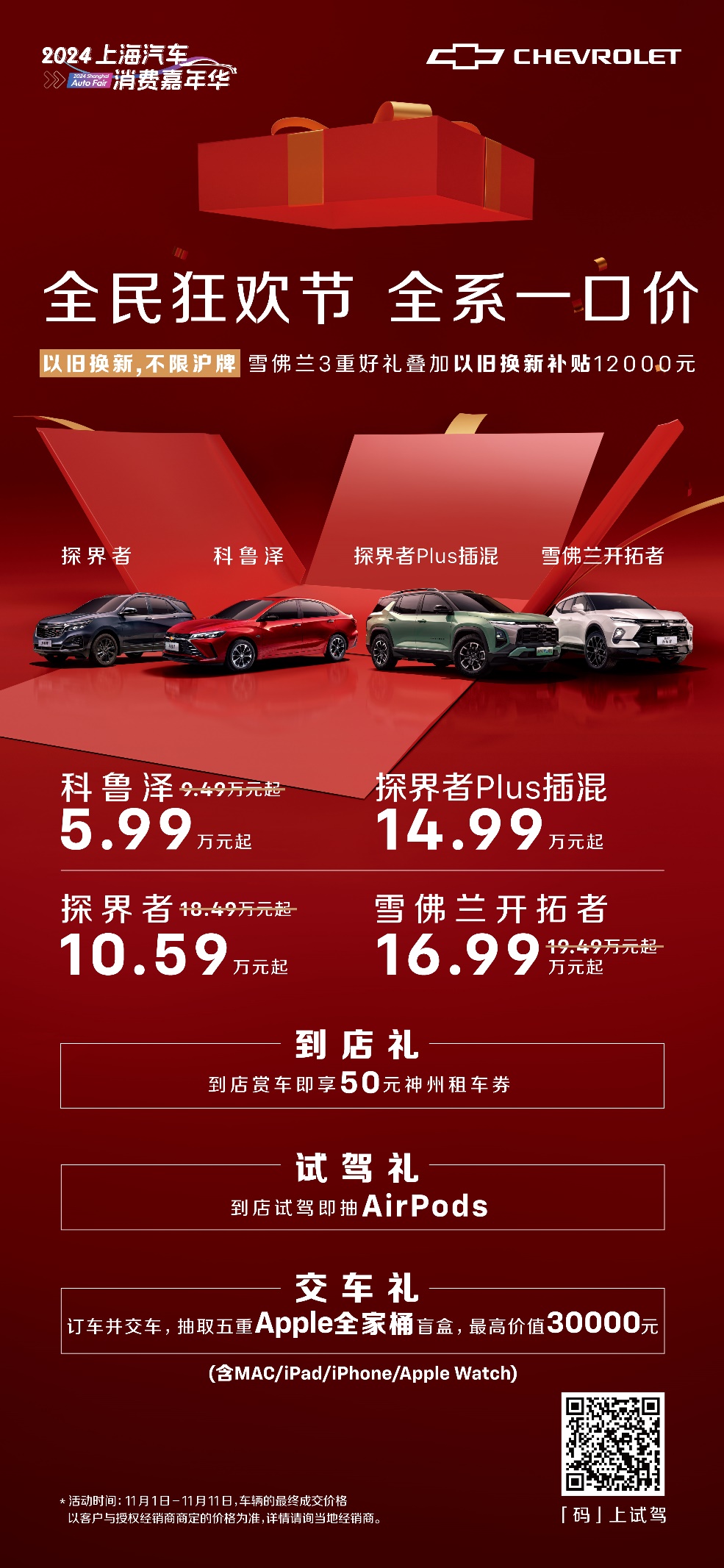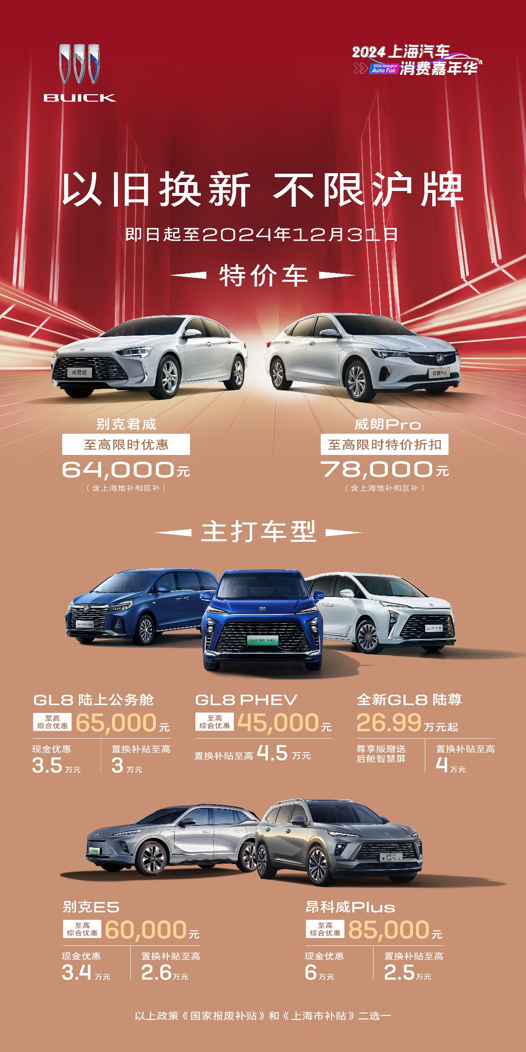 近段时间,上海市出台了一系列促消费举措,给广大市民带来了实实在在的福利。在11月初,上海又针对汽车领域发布了新的以旧换新政策:即日起至2024年12月31日,消费者在上海通过旧车置换购买纯电动车或燃油车,符合特定条件的可享受政府一次性补贴1.5万元或1.2万元,均不限沪牌。作为上海本土龙头车企,上汽通用汽车积极响应政策号召,携旗下凯迪拉克、别克和雪佛兰三大品牌超50家上海本地门店倾情参与,以诚意满满的置换礼、低首付方案、限时一口价及超值特价车等专属福利,回馈广大新老客户的支持与信赖。
