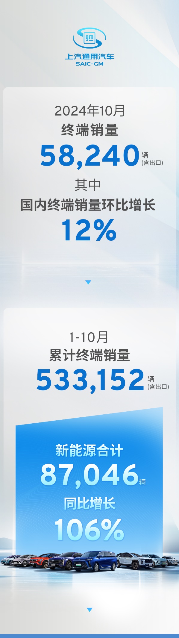11月第一天,上汽通用汽车公布了10月份销量成绩单,数据显示,其2024年10月终端销量58,240辆(含出口),其中国内终端销量环比增长12%,连续保持月销量环比增长;1-10月累计终端销量533,152辆(含出口),其中新能源合计87,046辆,同比激增106%。全新XT5、全新昂科威Plus等车订单火爆,终端供不应求,目前正呈现出持续攀升的势头。新XT6也即将在2024广州车展发布亮相,带给消费者全面进阶的豪华格调和尊崇体验。