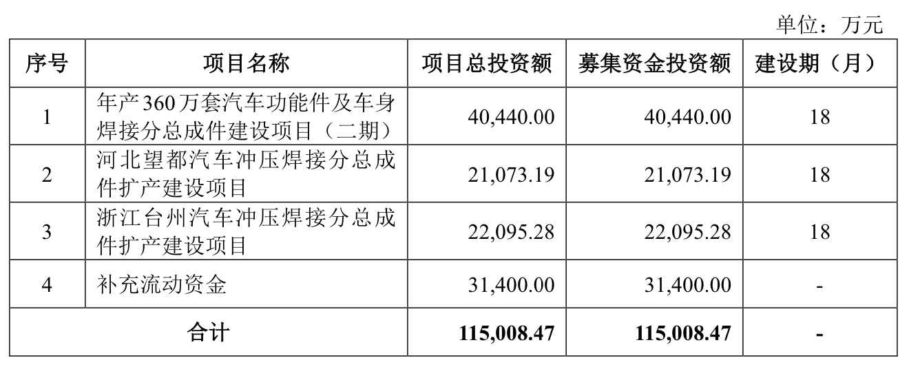 此次计划募资的11.5亿元,除了补流3.14亿元外,其余投入到“年产360万套汽车功能件及车身焊接分总成件建设项目(二期)”4.04亿元,“河北望都汽车冲压焊接分总成件扩产建设项目”2.11亿元,“浙江台州汽车冲压焊接分总成件扩产建设项目”2.21亿元。