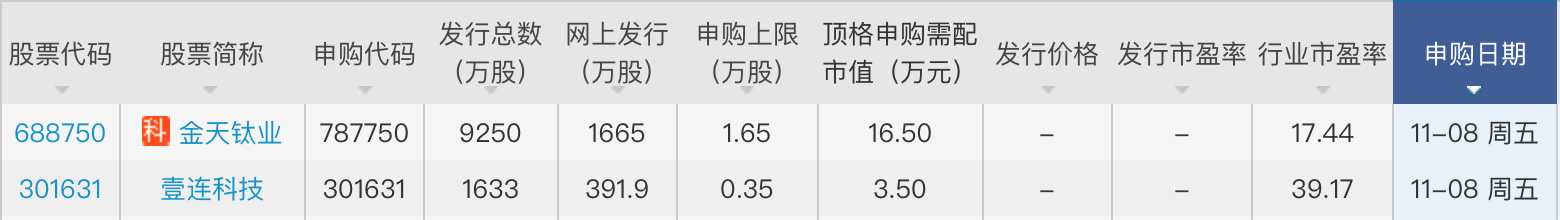 本周,11月8日周五,新股申购有标的可选,分别是创业板的壹连科技(301631.SZ),以及科创板公司金天钛业(688750.SH)。
