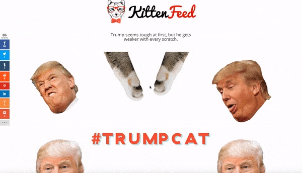 据美国《观察者报》21日报道,这名来自旧金山的女孩露西是个酷爱网络技术的高中生,最近正在申请网络开发方面的工作,为以后加入梦想中的科技公司做准备。她想让她的简历中多点“小小的、有趣的”项目,所以花了短短3个小时创建了一个名叫“特朗普抓”(TrumpScratch)的网站,在上面,用户可以用小猫咪的爪子抓特朗普的脸。