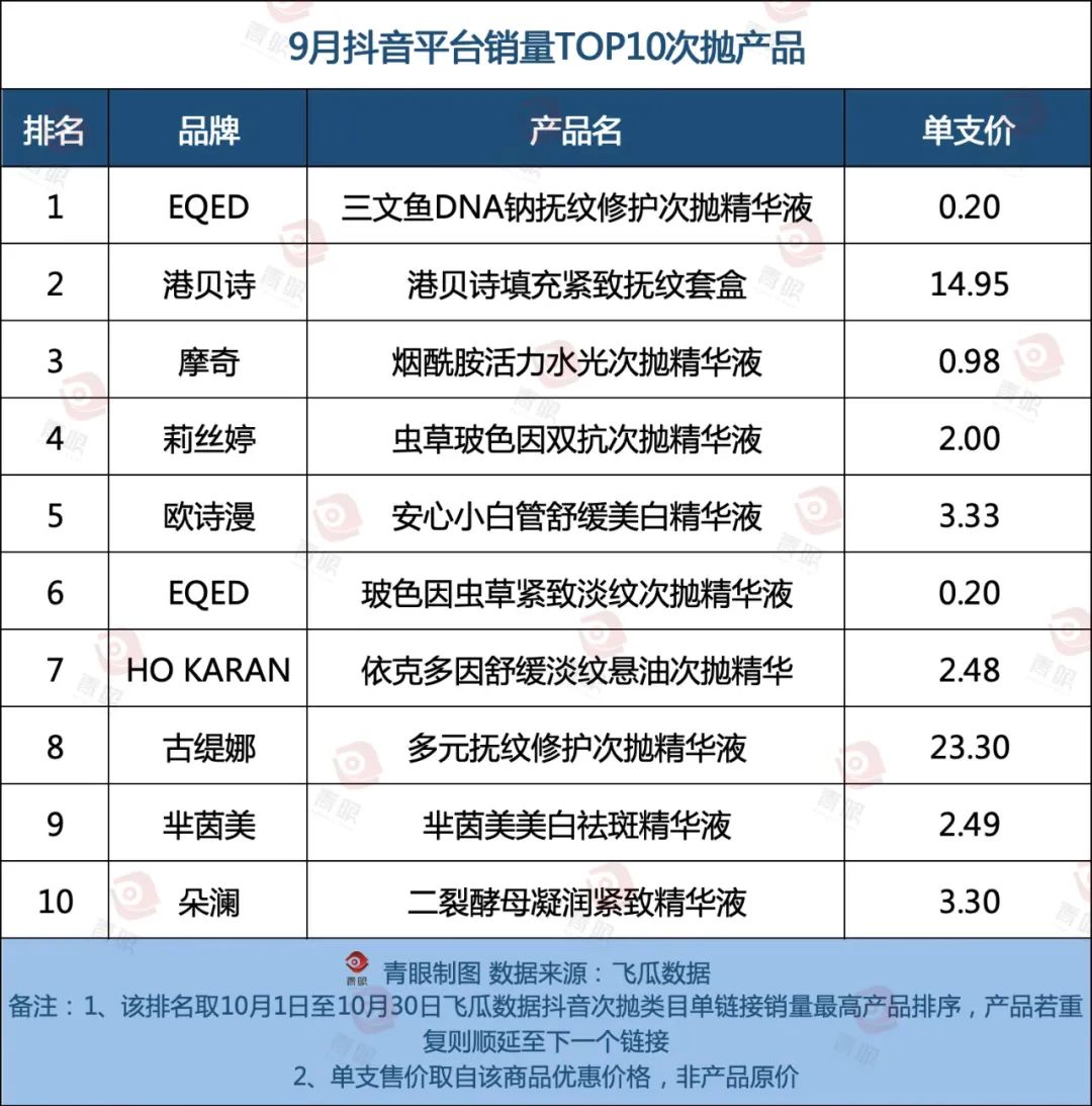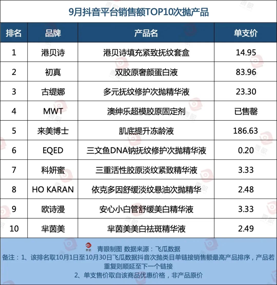 有意思的是,青眼注意到,从抖音单月销量榜单来看,次抛产品价格差异较大。除低价次抛产品外,也有一批高价次抛产品出现,价格甚至超过科兰黎等知名外资品牌。例如,位列9月抖音销售额TOP2的初真双胶原奢颜蛋白液,单支售价甚至超80元。