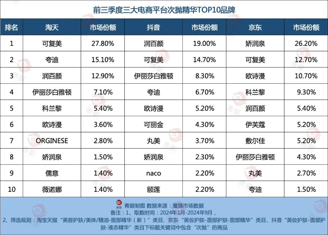 值得一提的是,虽然最早的“次抛”的火是由润百颜、夸迪等品牌燃起,但目前来看,次抛市场已然呈现百花齐放的市场格局,且头部市场份额均由国货品牌占据。例如,据魔镜市场数据,前三季度淘天TOP10品牌中,仅有伊丽莎白雅顿、科兰黎和ORGINESE三个外资品牌,抖音更是9成均为国货品牌。