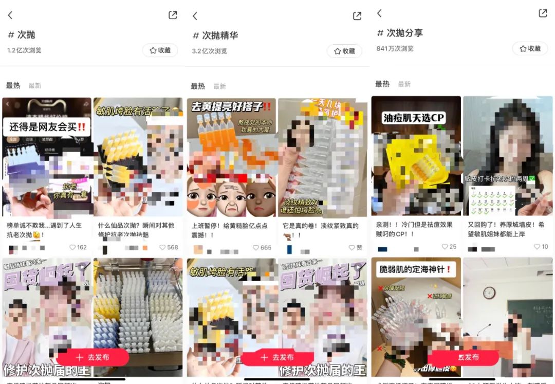 目前,在小红书平台,#次抛#话题浏览量已超1.2亿,#次抛精华#浏览则超3.2亿次,有超86万篇笔记在讨论“次抛精华使用方法”;在抖音平台,#次抛#相关话题播放量已达9亿次,#次抛精华#话题播放量更是达到29亿次。