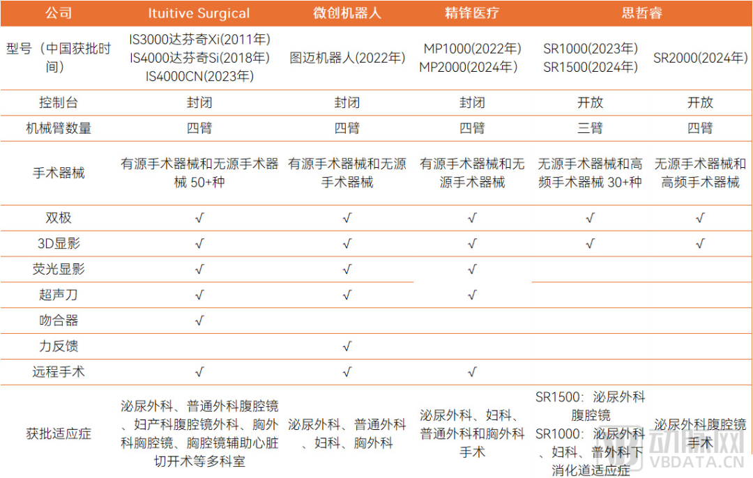 国产主要腔镜手术机器人与达芬奇功能对比