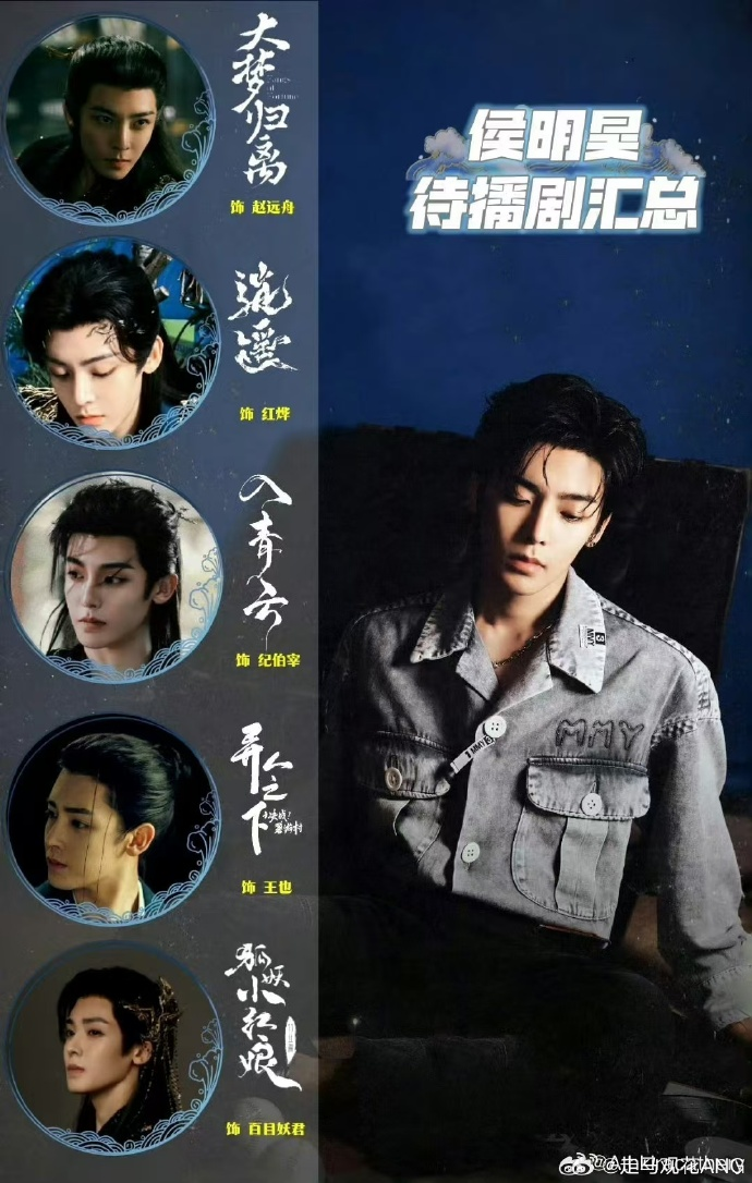 侯明昊2023年通过《护心》再战古偶赛道,之后无缝进组,陆续拍摄了《少年白马醉春风》《大梦归离》《逍遥》与《入青云》。今年前两部已播但是未能助其飞升,综艺《花儿与少年6》还令他风评大跌,但后两部一个拍完待播,一个开机在拍,都已无法掉头。