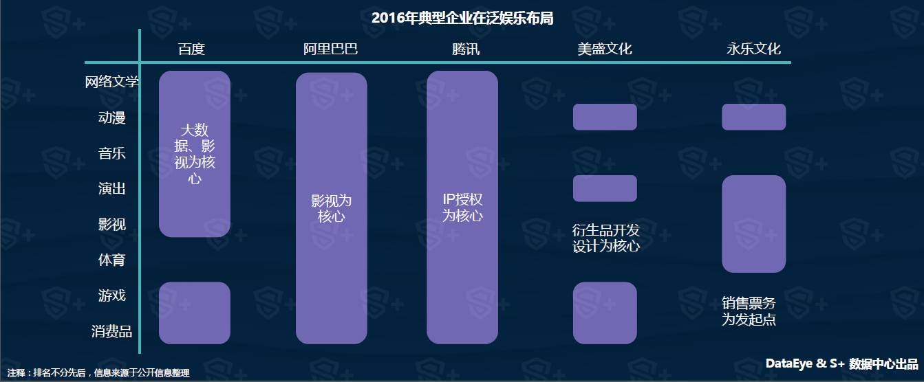 其次是传统行业巨头,利用自身的优势,往IP源头及相关泛娱乐形态布局。如美盛文化以IP衍生品开发设计为核心布局泛娱乐板块,永乐文化围绕影视宣发及体育赛事运营等领域布局泛娱乐板块。
