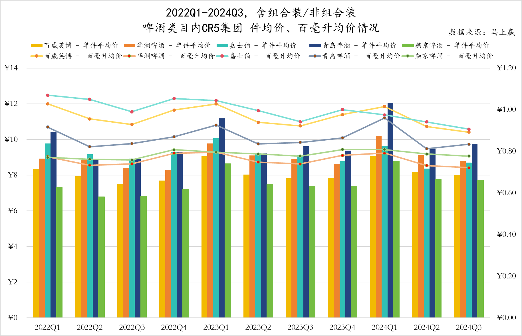 虽然各个企业都各有各的“价格带舒适区”,但随着竞争格局的变化,不同集团的定价策略也有所调整。从2022Q1到2024Q3,结合几个集团的件均价与百毫升均价变化来看: