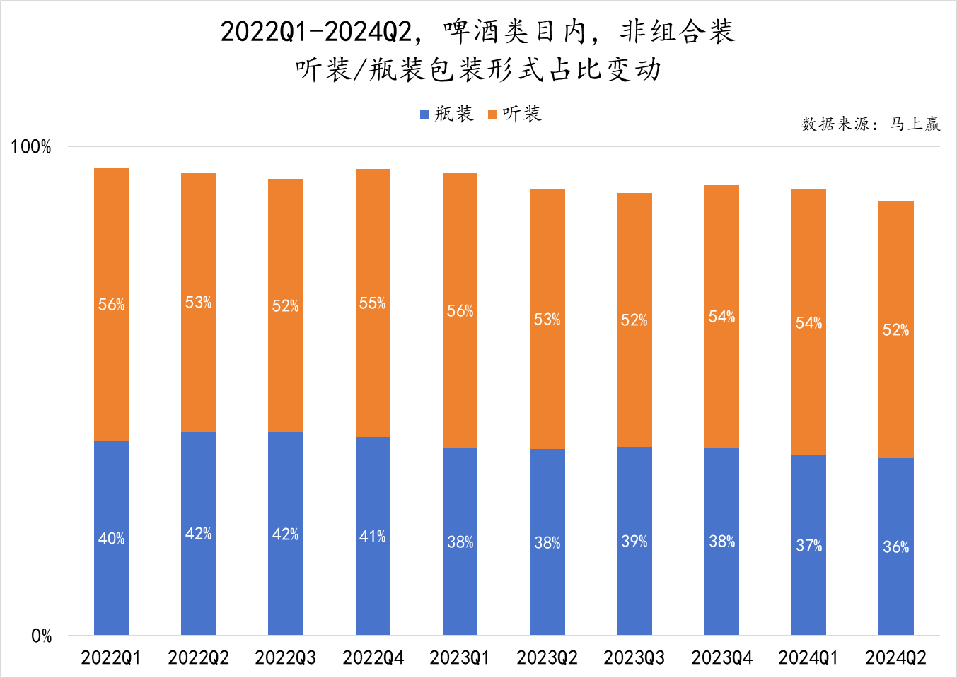 基于马上赢品牌CT中的数据,我们可以看到在啤酒类目内非组合装产品中,听装产品的市场占比持续高于瓶装产品。这一趋势反映了当下主流消费者对听装啤酒的偏好——更加便携、易于饮用以及更加丰富多彩的包装。这些特点使得听装啤酒能够适配多种消费场景,从户外活动到当下流行的街边即饮,不仅限于传统餐饮场景。