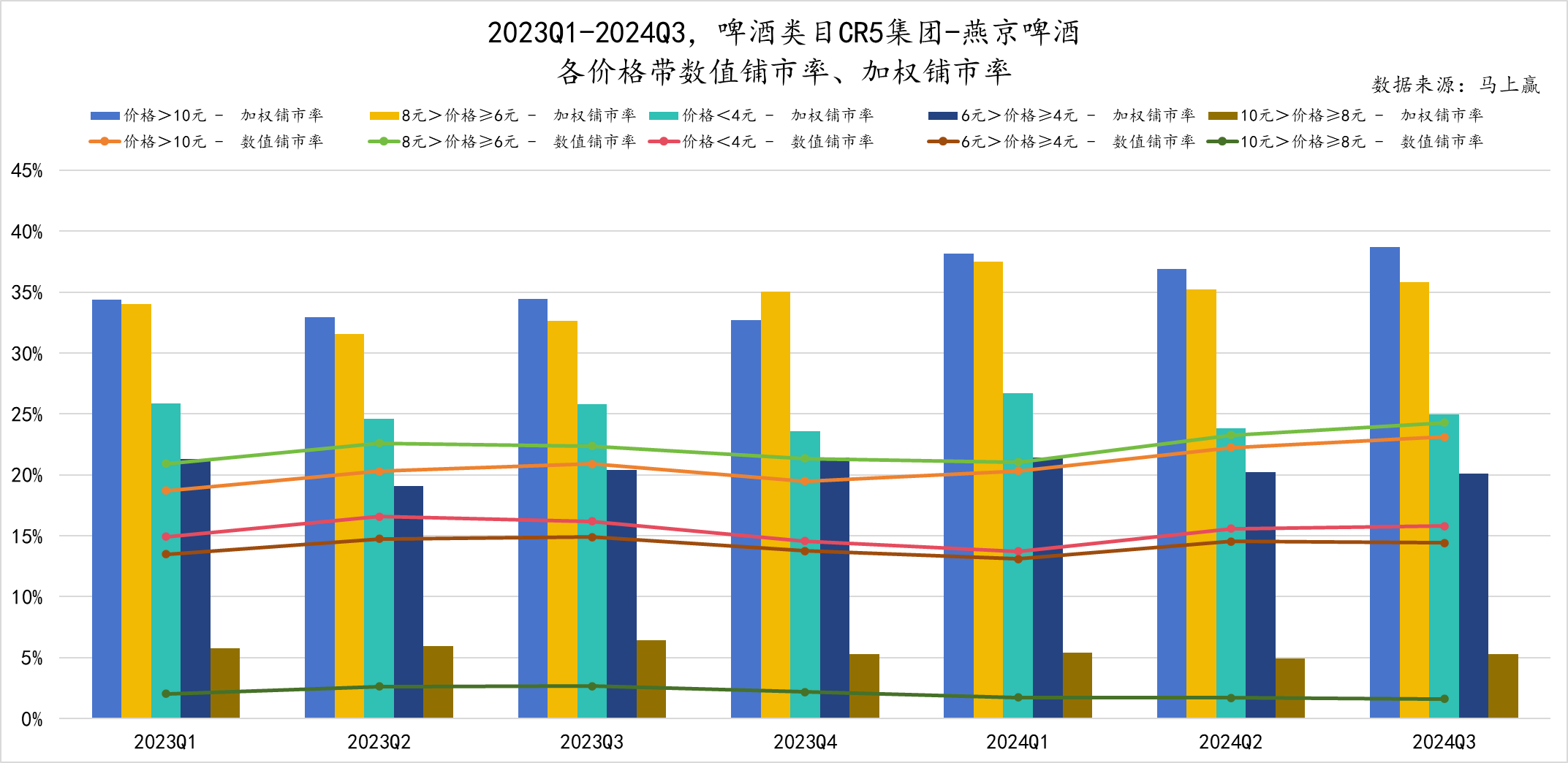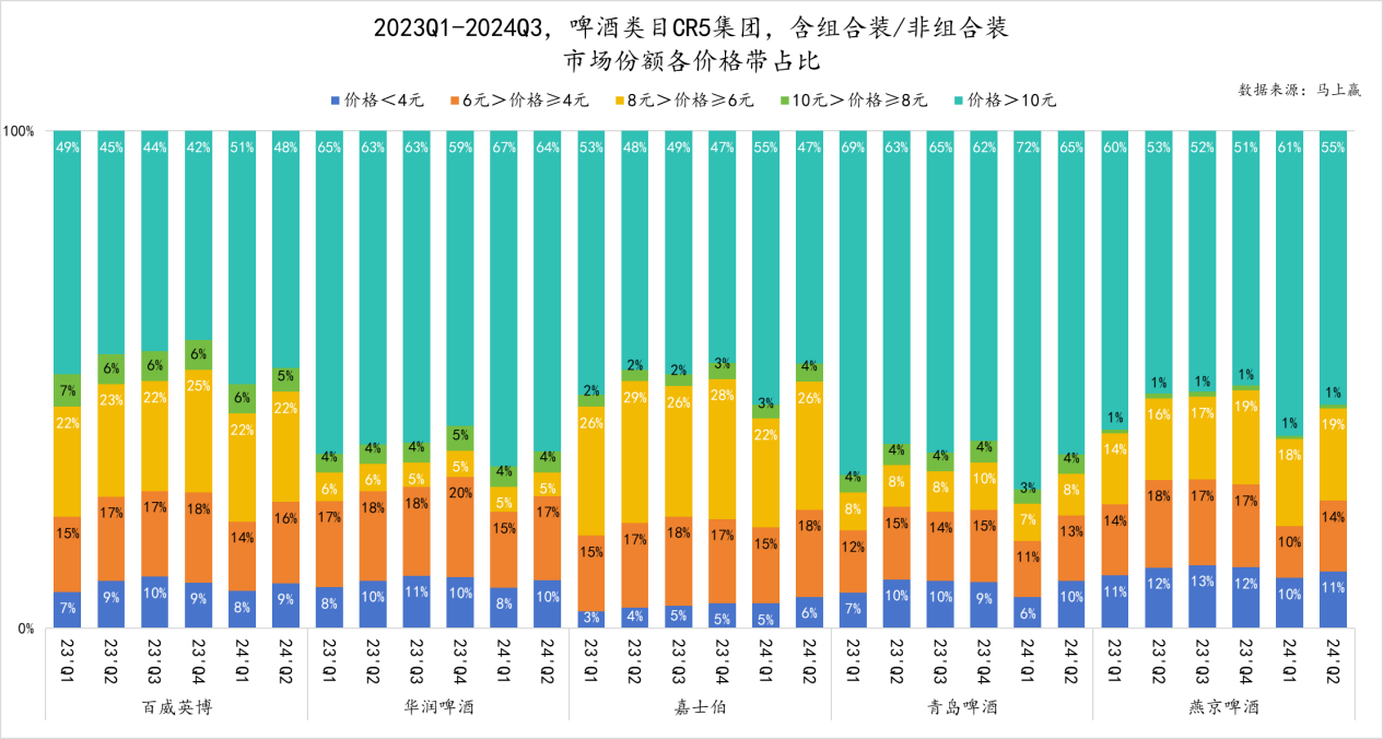 在啤酒整体进入存量市场竞争的当下,各大集团本质上是在争夺下一个“主流价格带”的所有权——根据CR5集团的加权铺市率现状分析,10元以上(包含组合装)、6~8元两个价格带对于头部集团或许竞争更加激烈。