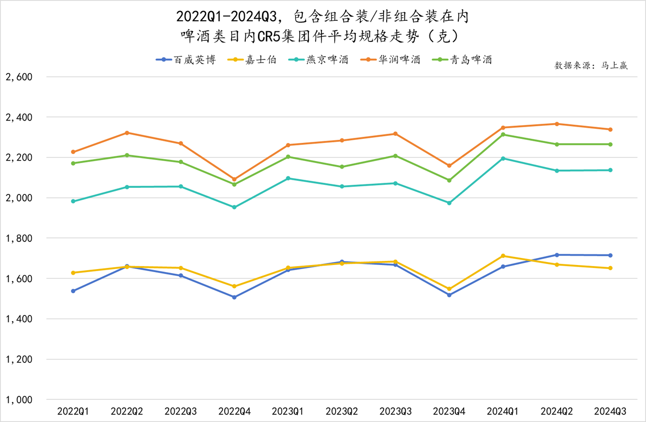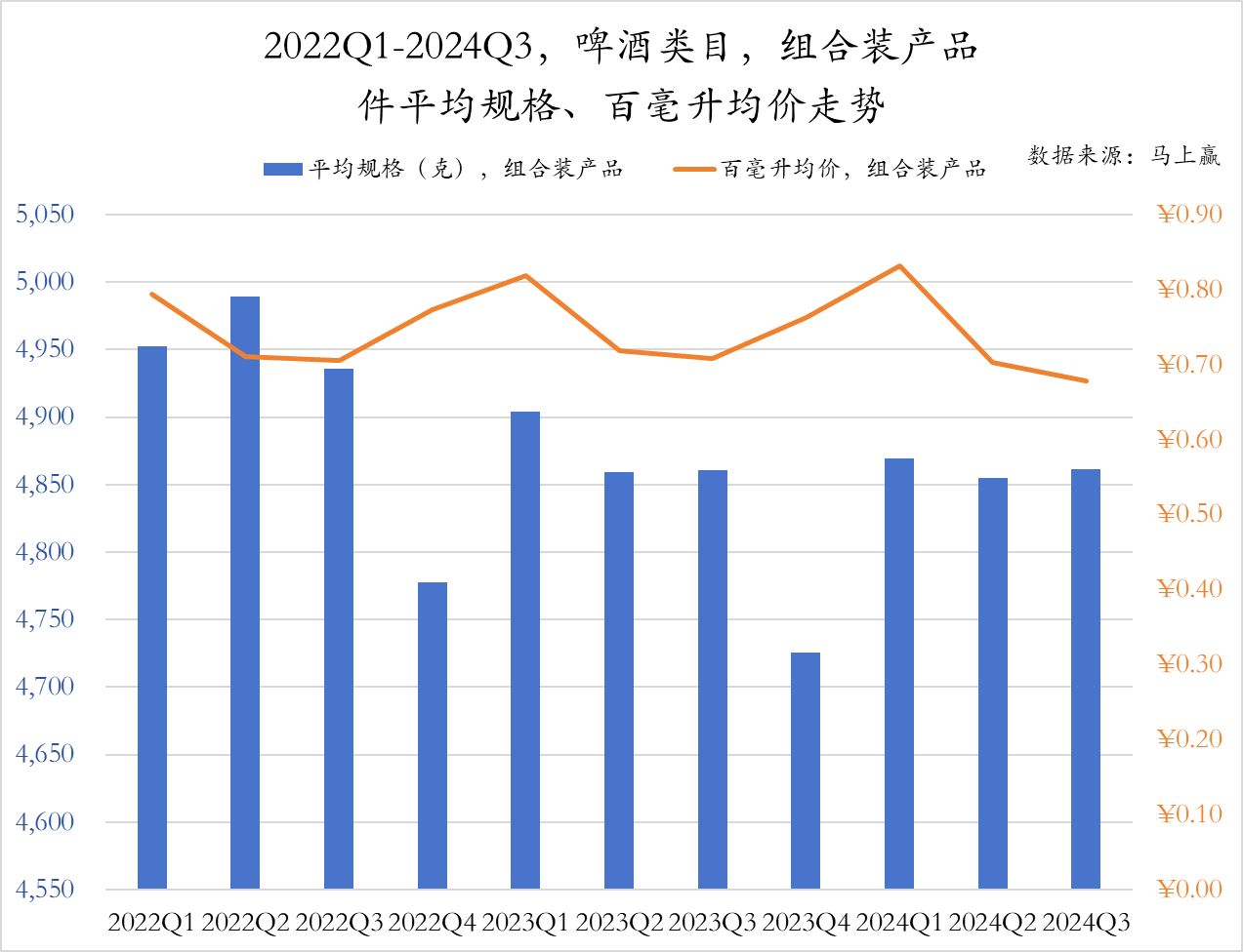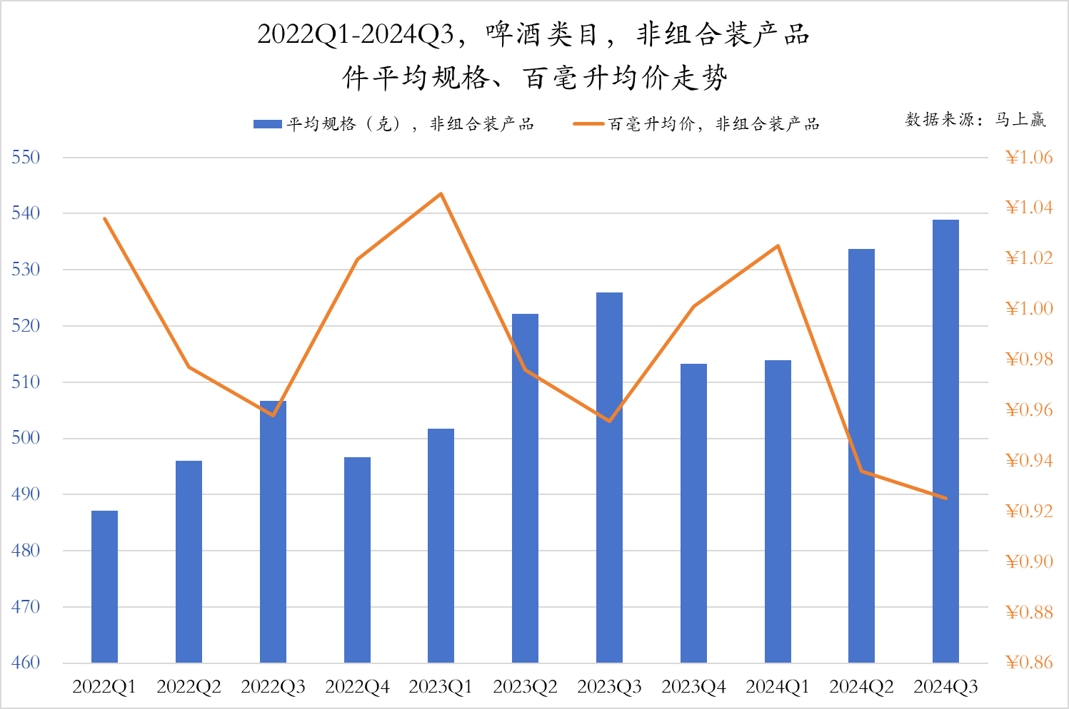 - 非组合装产品每年Q4平均规格略高于Q1,而组合装产品每年Q1平均规格远远高于Q4,甚至会高于Q2、Q3——这或许是因为Q1虽然从季节而言是啤酒消费淡季,但受到春节聚餐、送礼场景的影响,组合装啤酒依旧有机会实现“价量双升”。