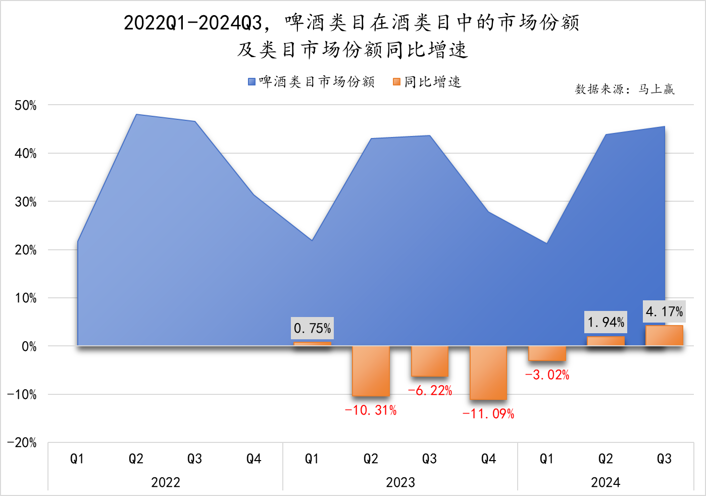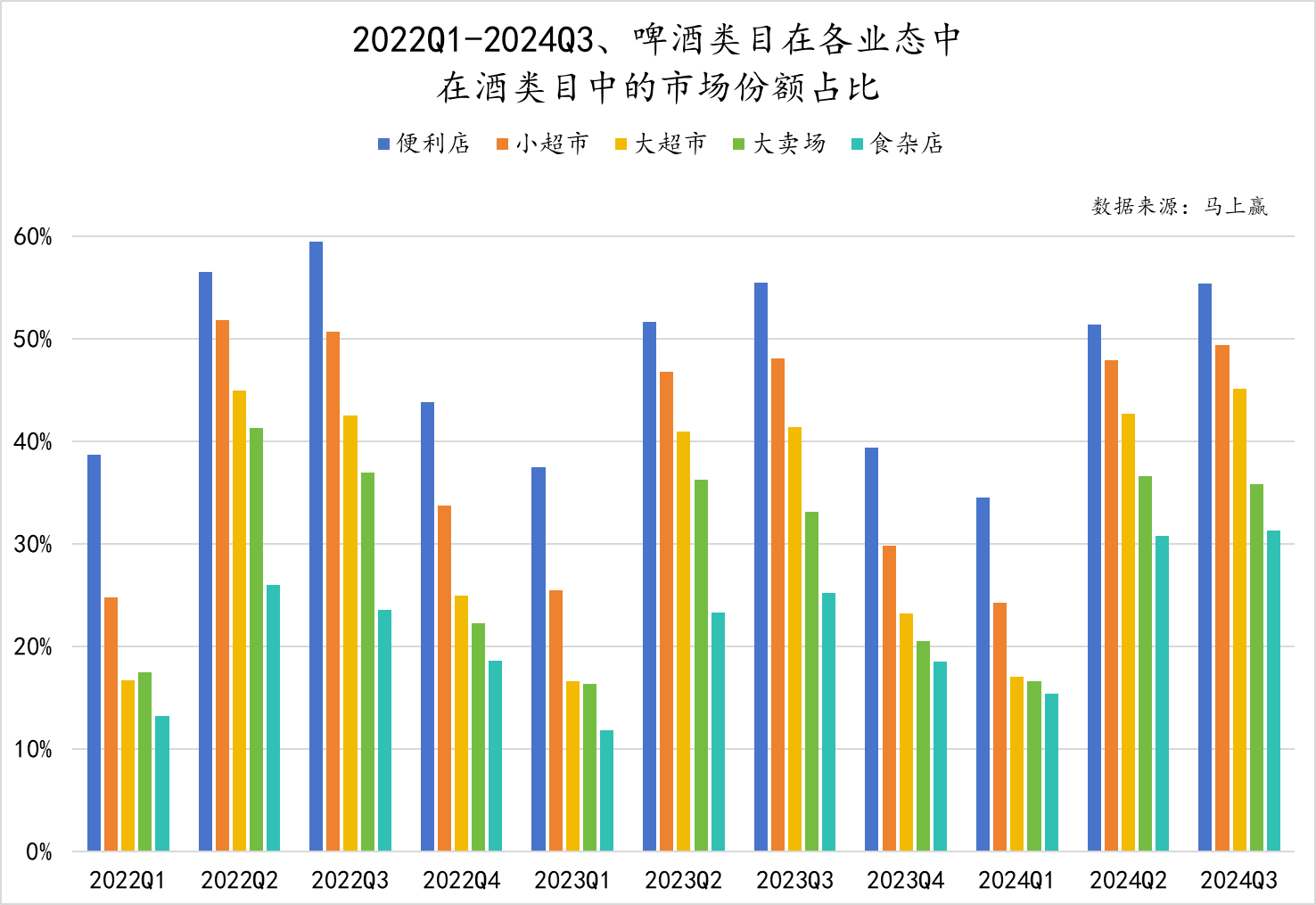 啤酒销售的季节性特征尤为明显,这与啤酒清爽、解腻、低度的特性相关。在春夏的Q2、Q3的市场份额显著高于秋冬的Q1、Q4,大约占到了整体零售业态中酒类销售的45%左右。相较之下,在全年中占比最低的Q1,这一占比仅约22%,约为高峰时期的一半。