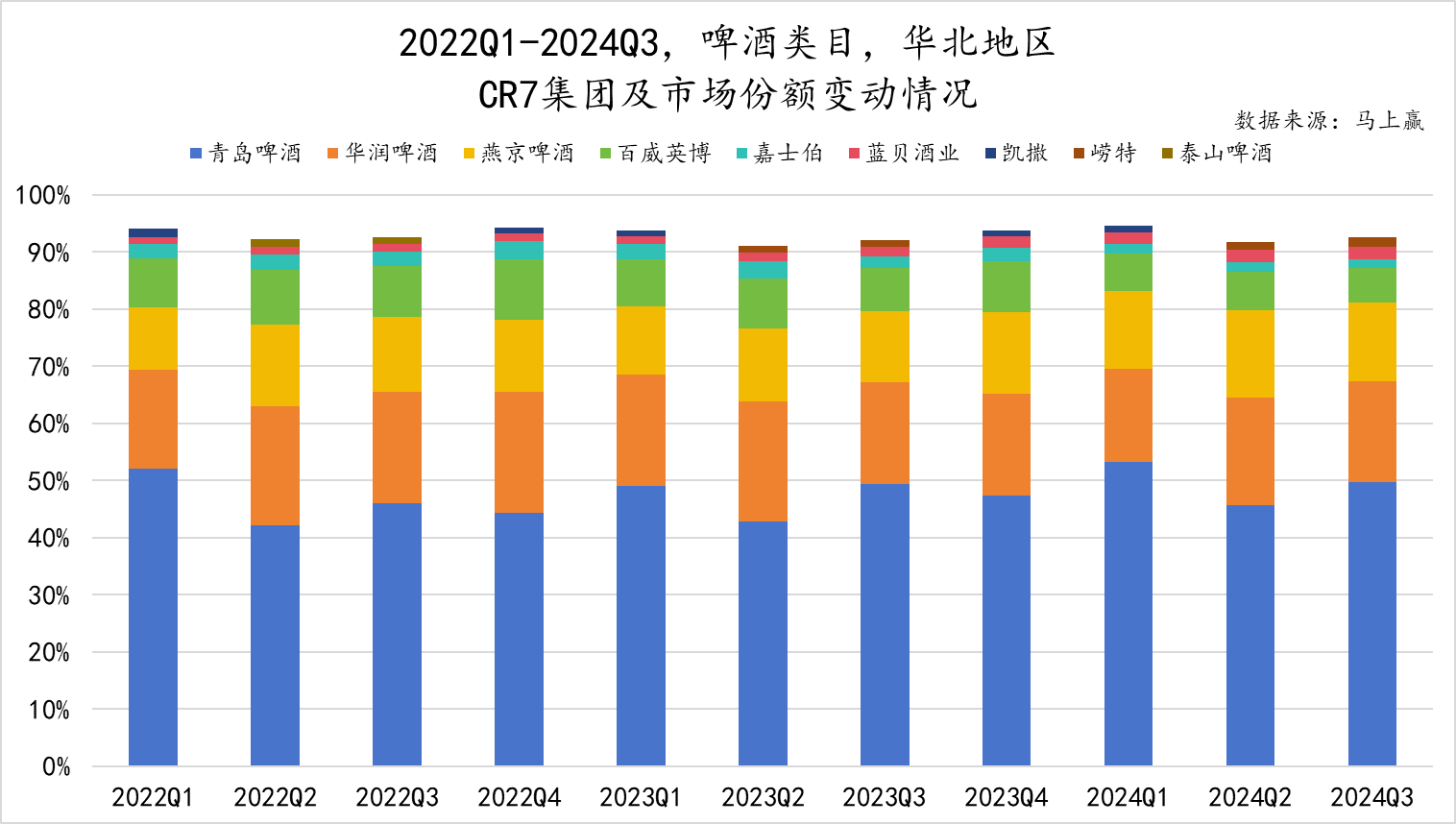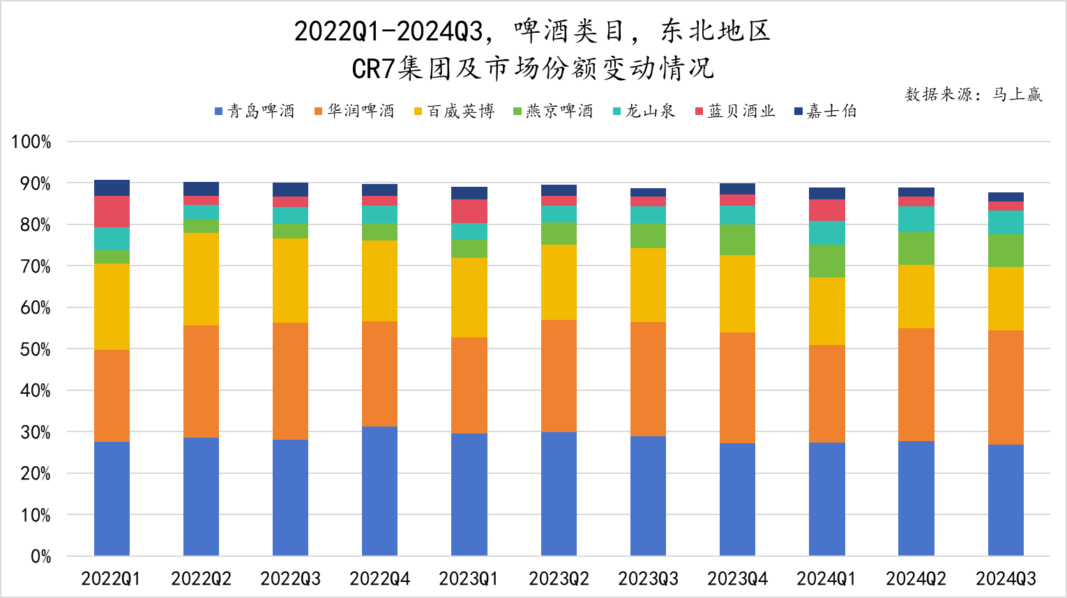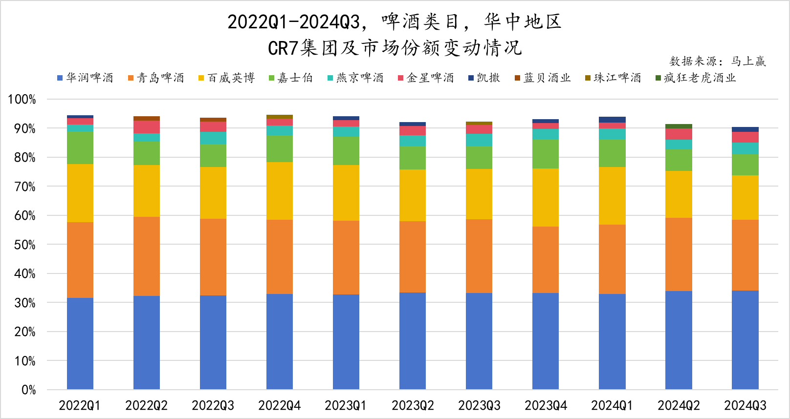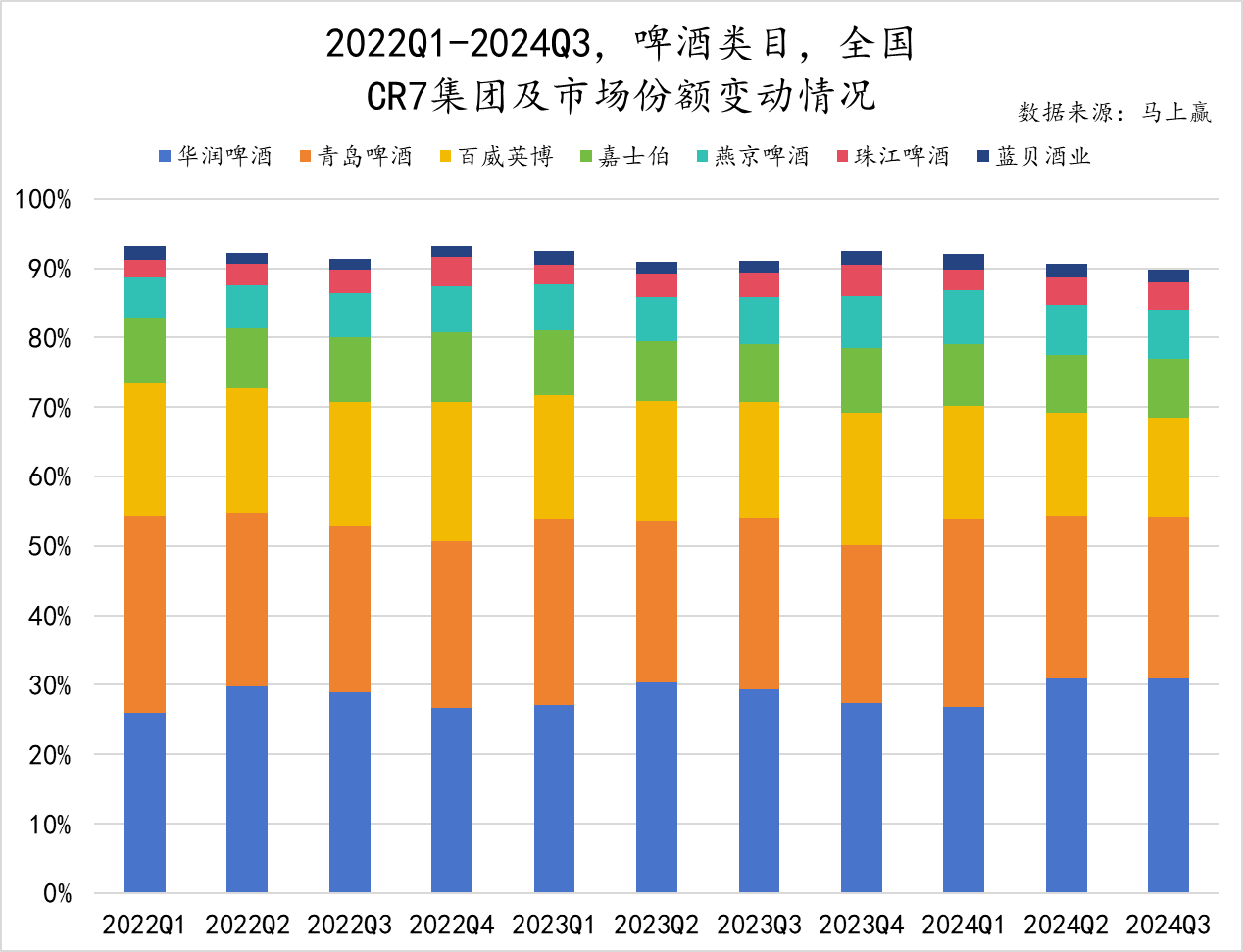 从2022Q1到2024Q3,CR7集团及排名都未发生变化,市场份额由高到低为:华润啤酒、青岛啤酒、百威英博、嘉士伯、燕京啤酒、珠江啤酒、蓝贝酒业。并且,CR7的市场份额总体基本保持稳定,约为90%。