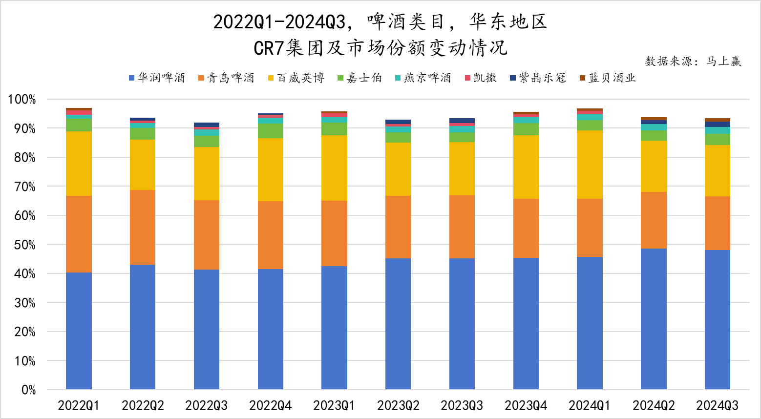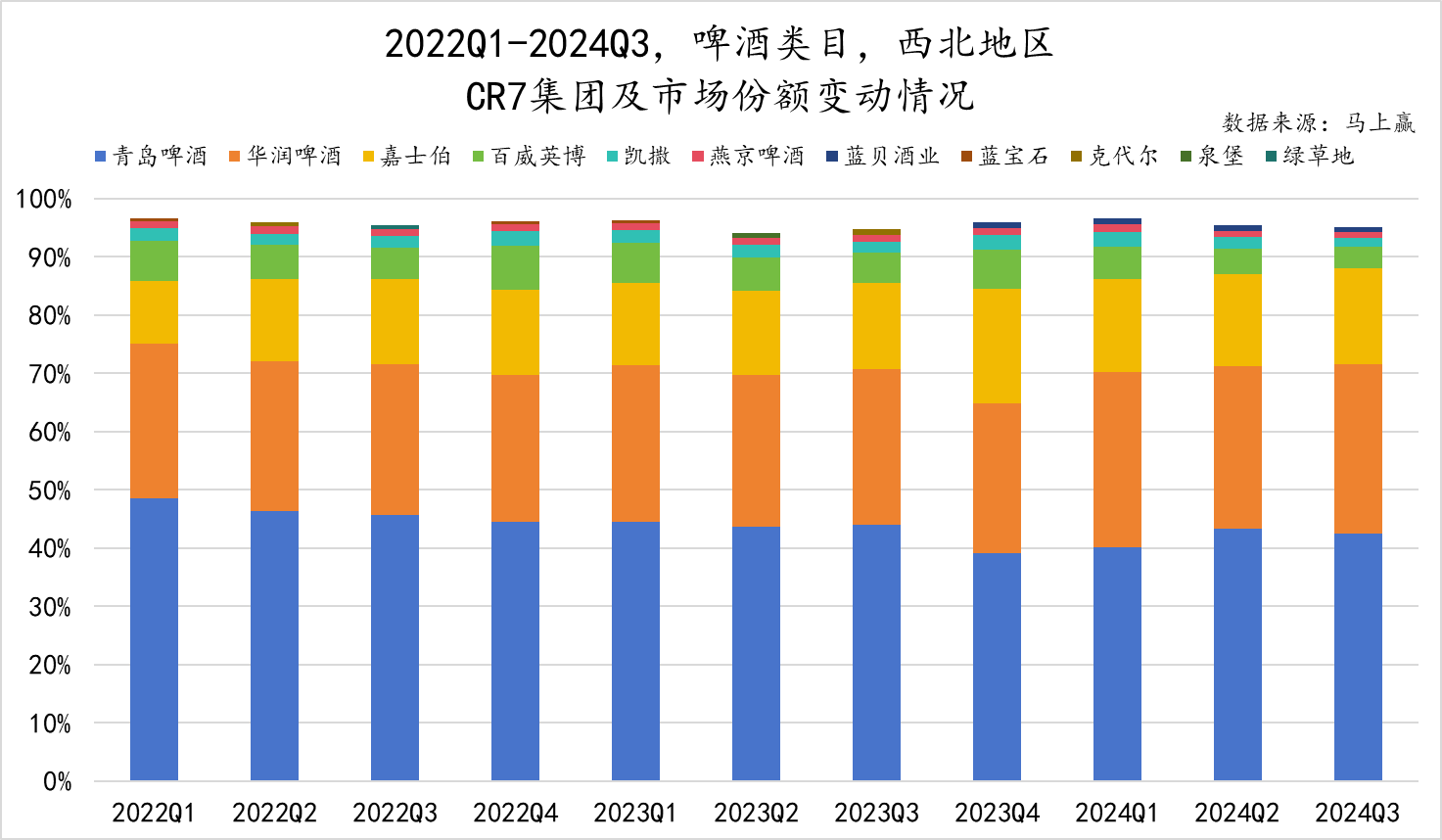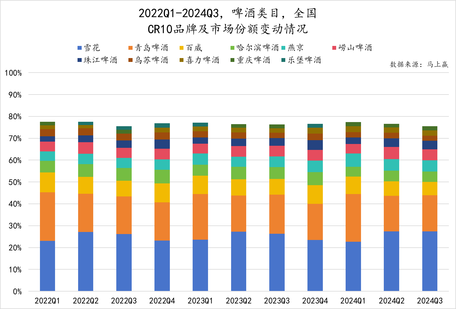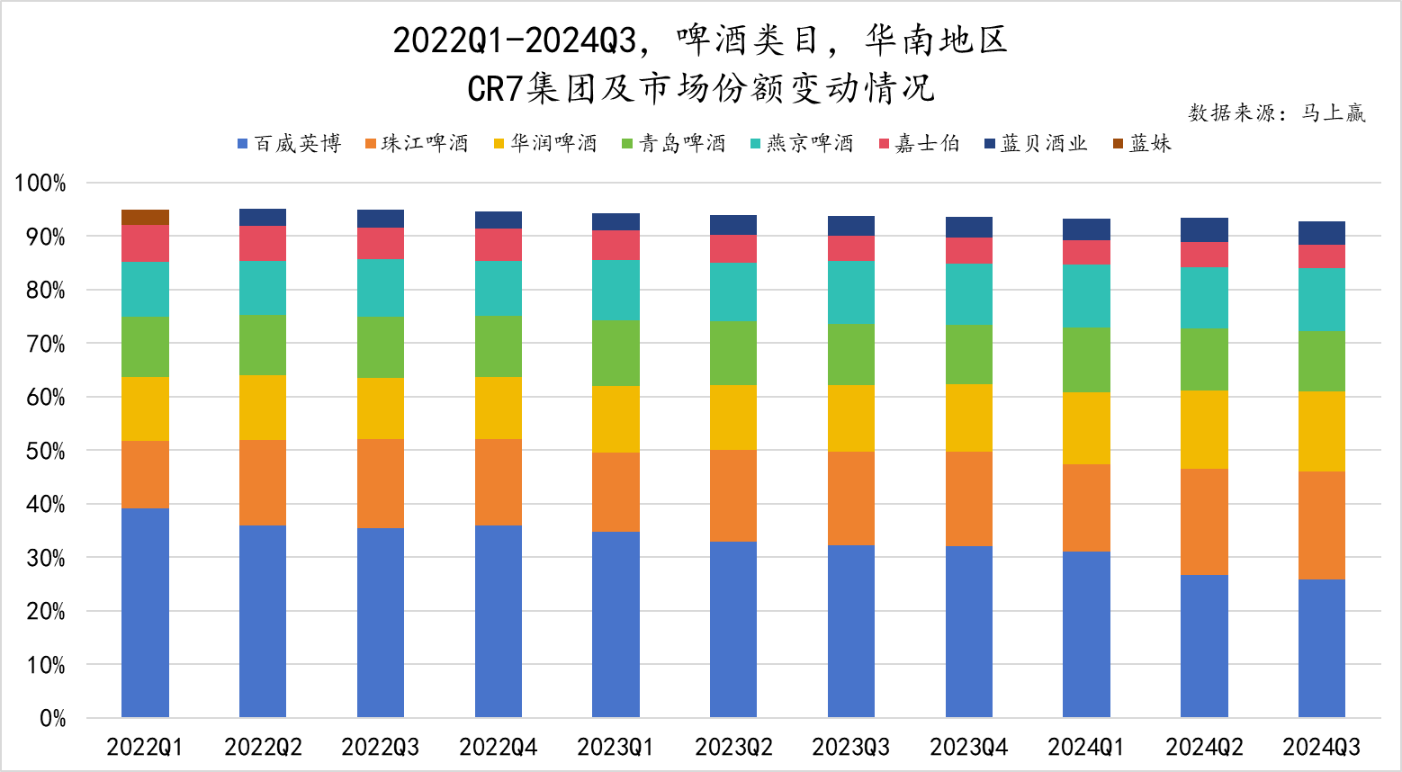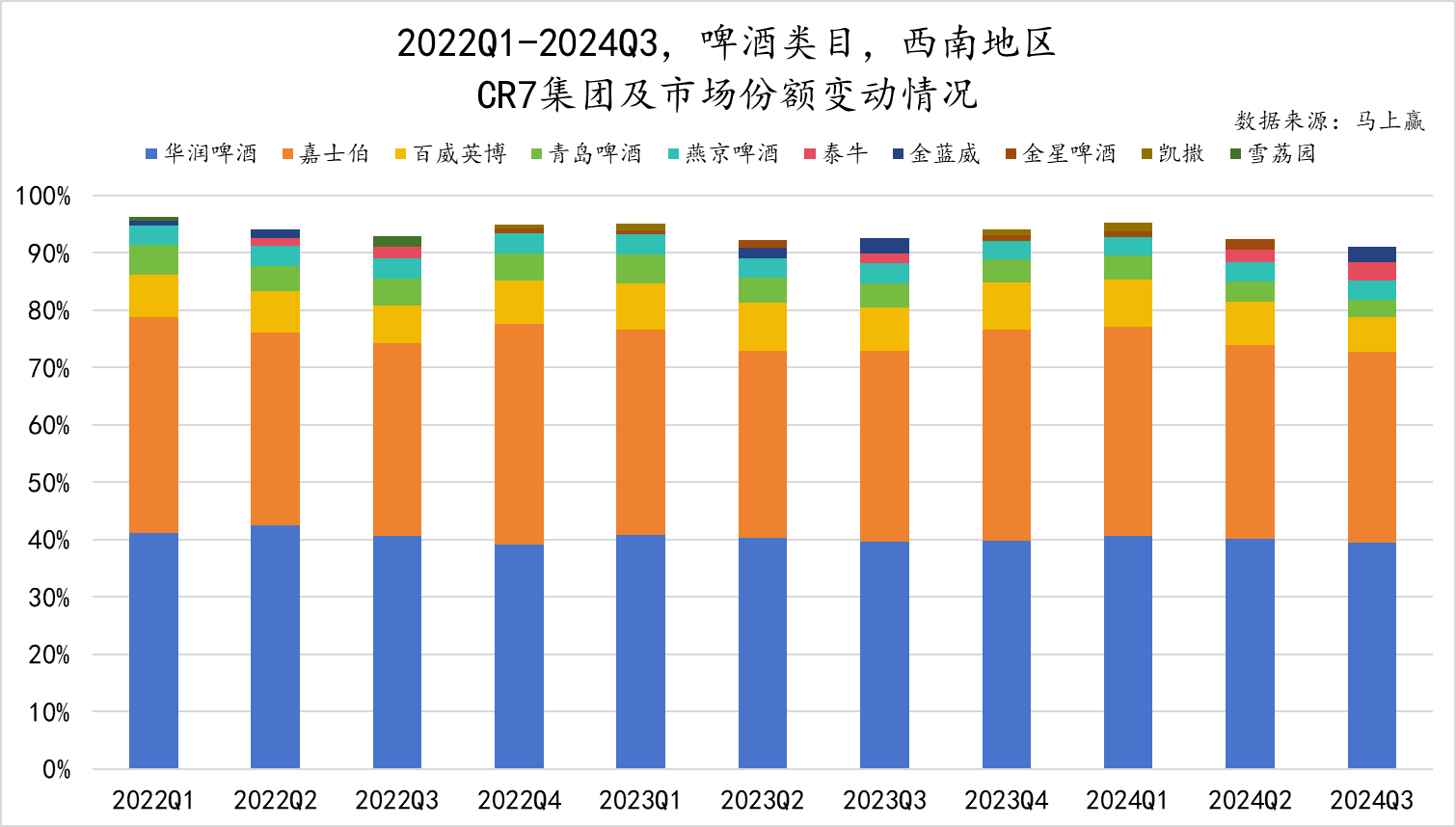 从2022Q1到2024Q3,CR7集团及排名都未发生变化,市场份额由高到低为:华润啤酒、青岛啤酒、百威英博、嘉士伯、燕京啤酒、珠江啤酒、蓝贝酒业。并且,CR7的市场份额总体基本保持稳定,约为90%。