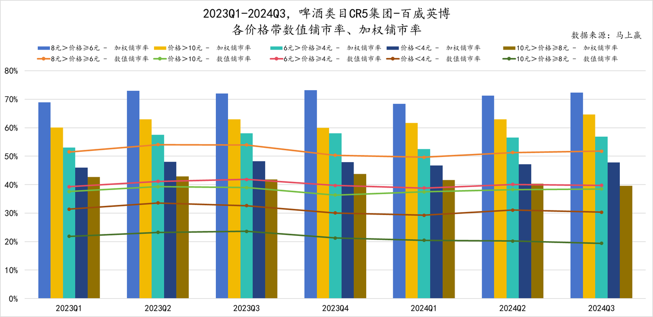 百威英博则选择在6~8元的价格带发力,其次是10元以上、4~6元、4元以下,8~10元价格带产品加权铺市率最低。