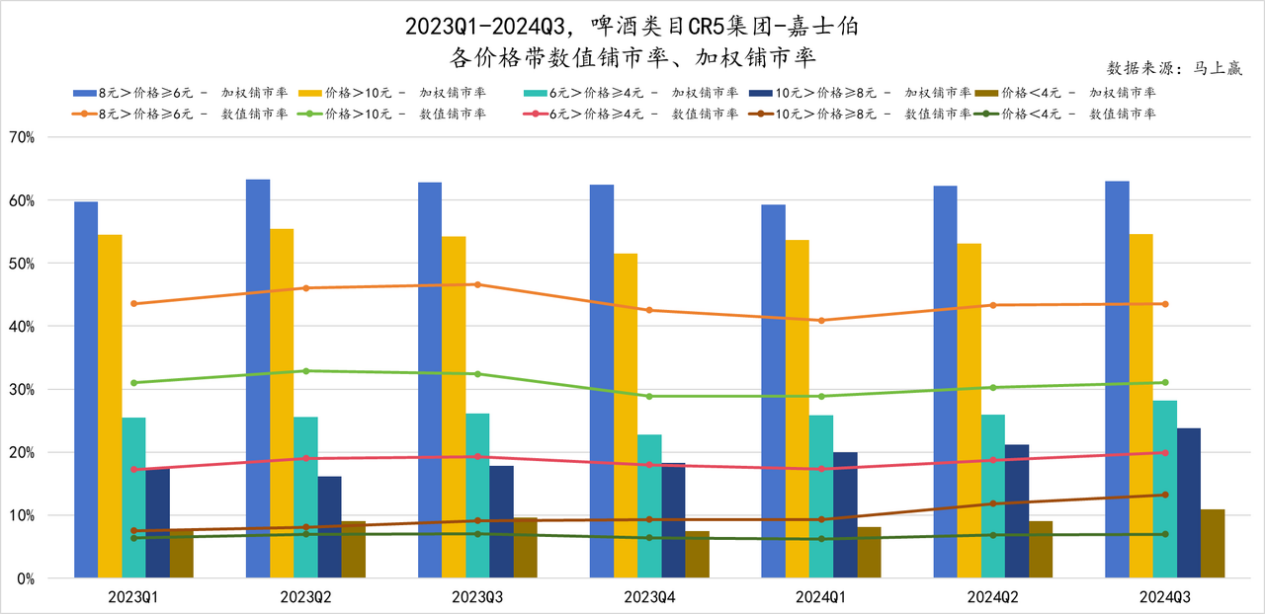 嘉士伯和百威英博一样,都选择在6~8元和10元以上的价格带发力,其次是4~6元,和百威英博不一样的是,嘉士伯4元以下价格带产品加权铺市率最低。
