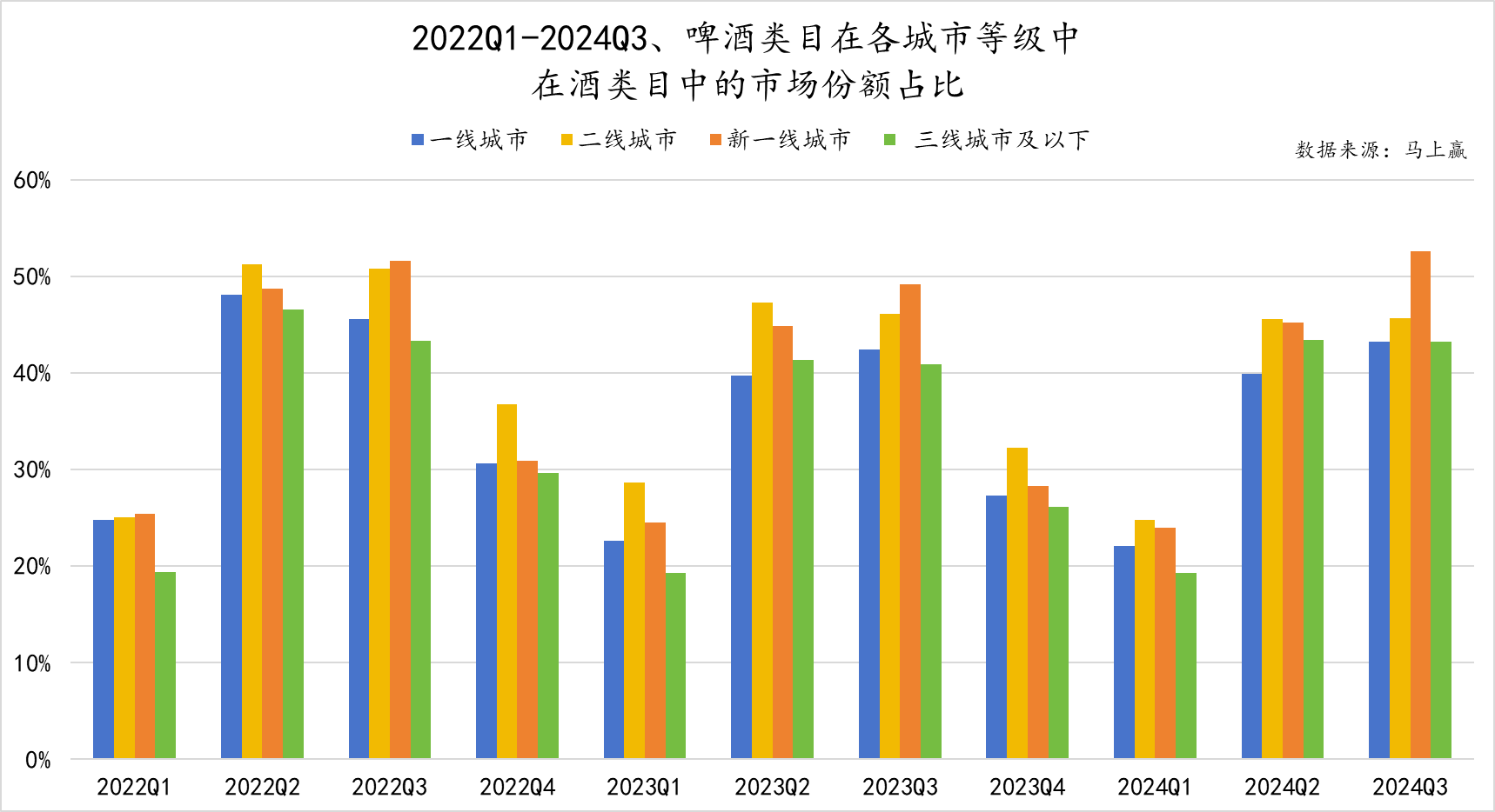 分城市等级看,整体而言,二线城市、新一线城市市场中,啤酒类目在整体酒类中的占比高于一线城市、三线城市及以下。其中,在淡季,啤酒在二线城市的市场份额较明显高于新一线城市;在旺季,啤酒则是在新一线城市表现更佳,市场份额较高且呈现出明显的增长。