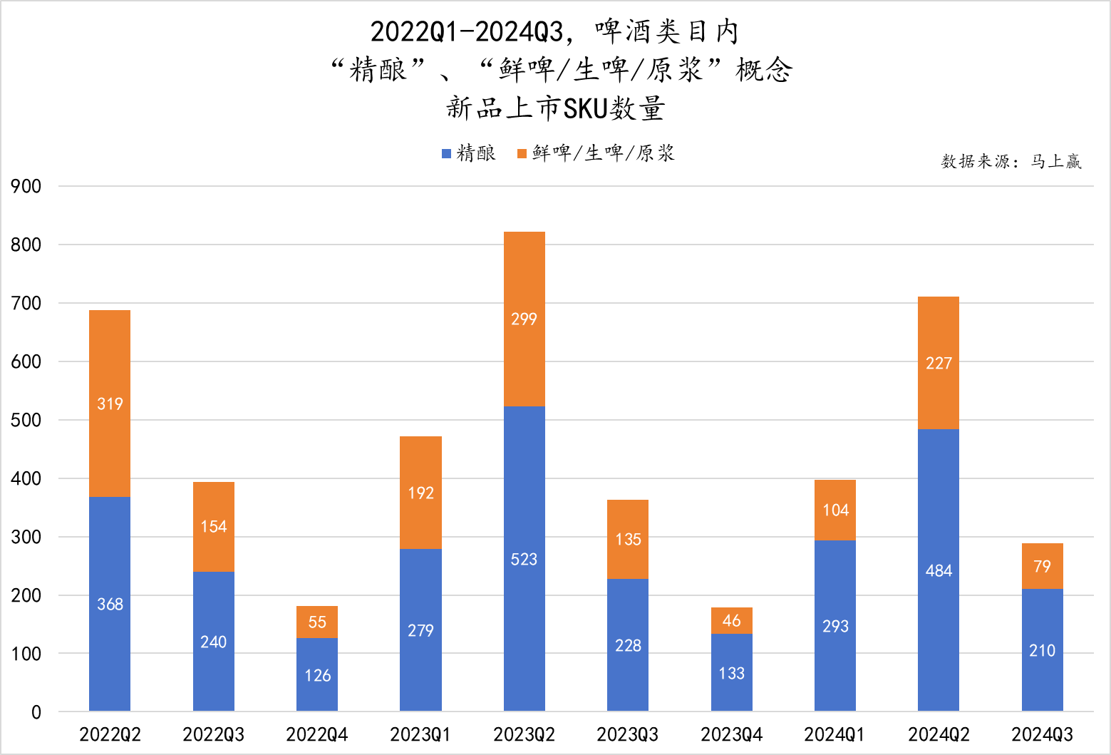 在2024年新品上市SKU中,“精酿”和“鲜啤/生啤/原浆”概念的产品数量占比显著,显示出市场对这类产品的强烈需求。