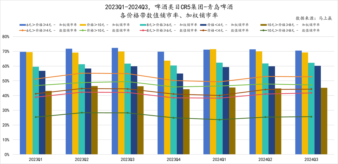 青岛啤酒加权铺市率最高的两个价格带和华润啤酒一样,都是4~6元和10元以上。但在两者之后,青岛啤酒优先选择了6~8元的价格带,然后才是4元以下和8~10元。