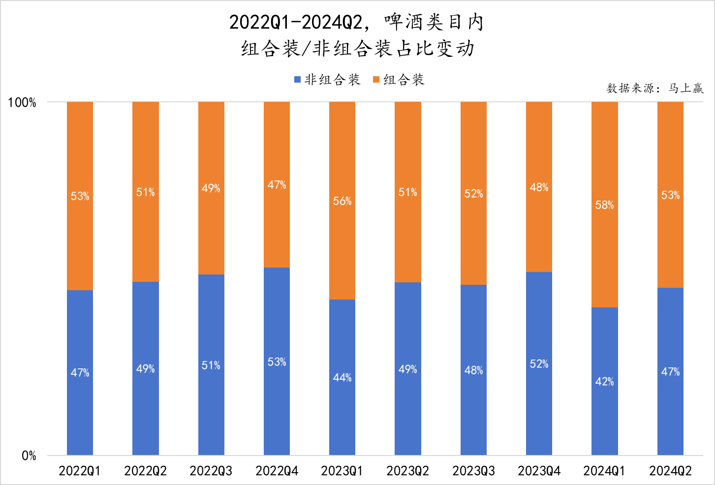 整体而言,啤酒组合装、非组合装的销售额占比接近于1:1。但今年截至目前,组合装销售额整体略高于非组合装。