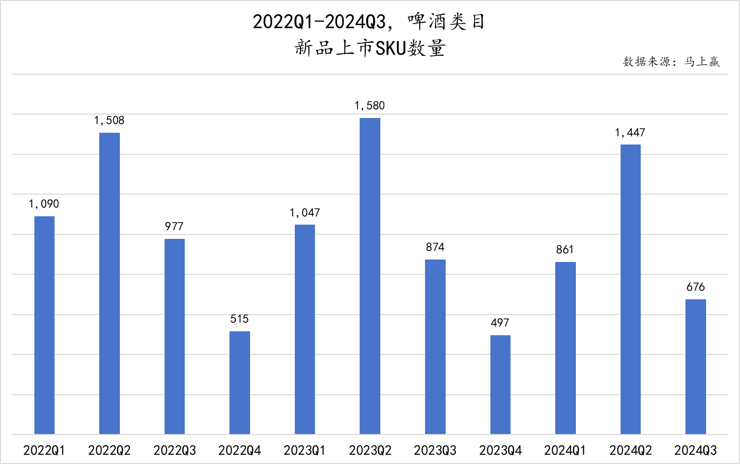 基于马上赢品牌CT中的数据,2022-2024三年中,啤酒类目的上新高峰在Q2,该季度的新品数量在2022-2024年均远高于其他季度。从几年的对比来看,2024年Q2新品上市SKU数量基本恢复到了之前的水平,甚至在Q3同比2023、2022两年还有所超越,或可以认为是行业对未来的乐观预期和持续的创新动力。