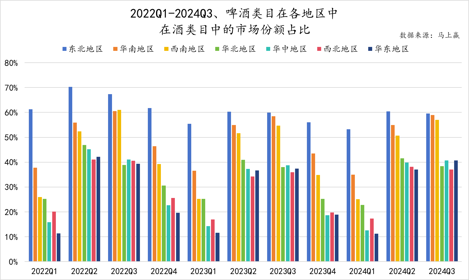 分地区看,东北地区啤酒在酒类市场的份额明显高于其他地区,其次是华南地区、西南地区,特别是在旺季能与其他地区拉开较明显的差距;市场份额较低的是华东地区、西北地区、华中地区,但与2023年同期相比,都有略微上涨。
