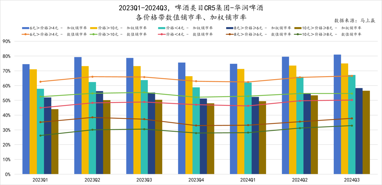 以华润啤酒为例,在不同价位的啤酒中,加权铺市率最高的是4~6元的啤酒,并且加权铺市率还在不断提升;其次是10元以上、4元以下一高一低,6~10元之间的两个档位排在最后。