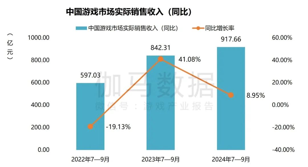 2024年7—9月,中国游戏市场规模为917.66亿元,环比增长22.96%,同比增长8.95%。移动、单机及主机游戏市场做出主要增长贡献,其中单机、主机市场受《黑神话:悟空》的销量提振影响较大,带来数十亿元增量。