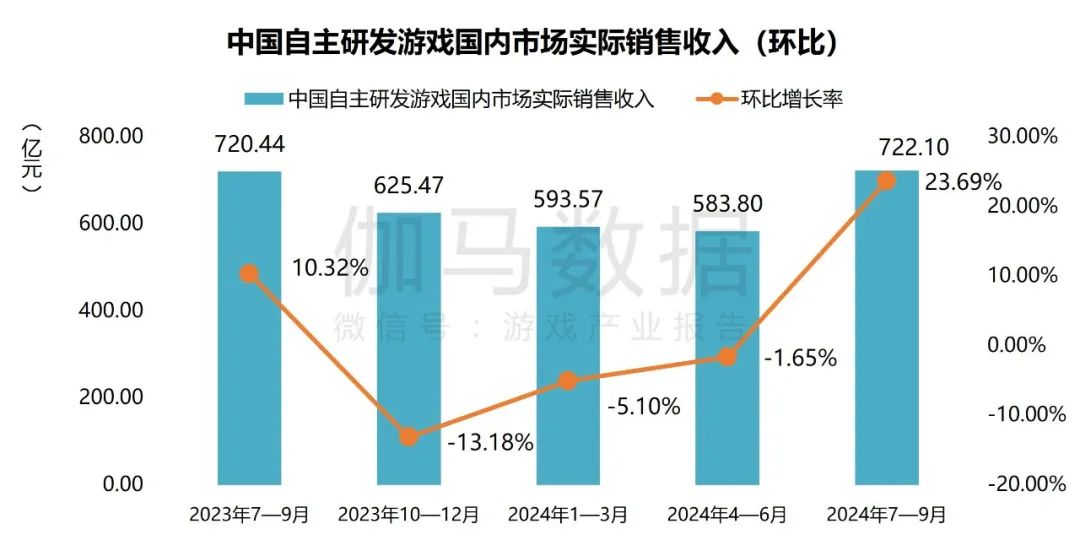 2024年7—9月中国自主研发游戏国内市场实际销售收入市场规模为722.10亿元,环比由降转增