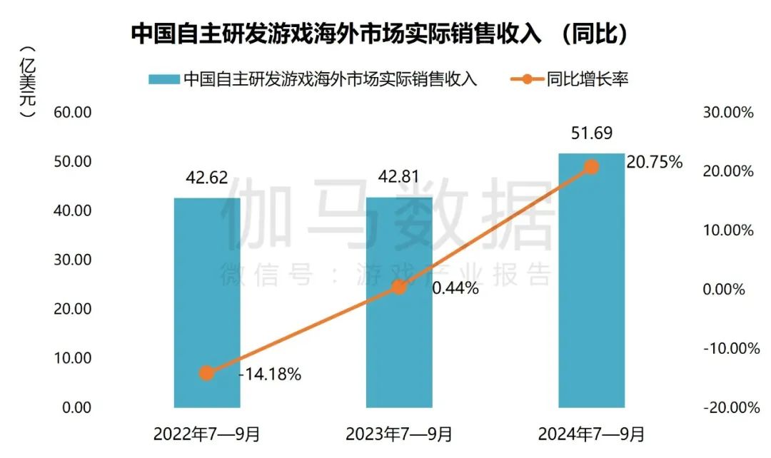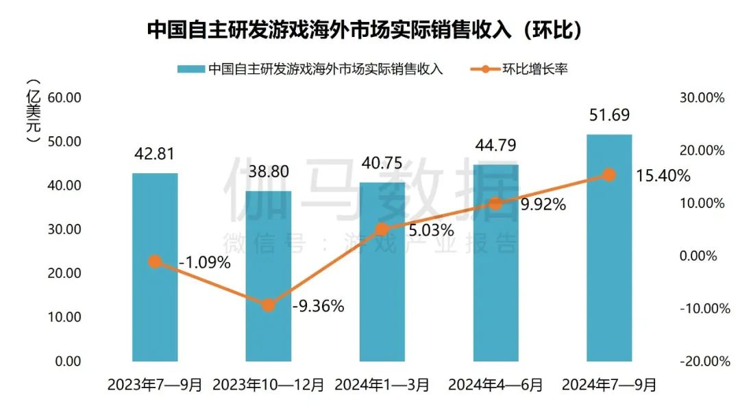 2024年7—9月,中国自主研发游戏海外市场实际销售收入为51.69亿美元,达近5个季度最大值,环比增长15.4%,同比增长20.75%。增长源于部分头部产品收入环比增长,新游《绝区零》表现良好以及《黑神话:悟空》的突出表现。
