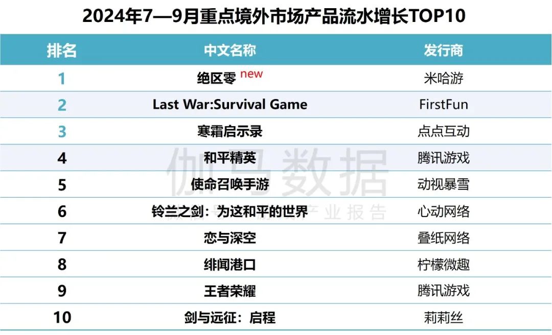 2024年7—9月重点境外市场产品流水增长TOP10中,新品《绝区零》获得第一。