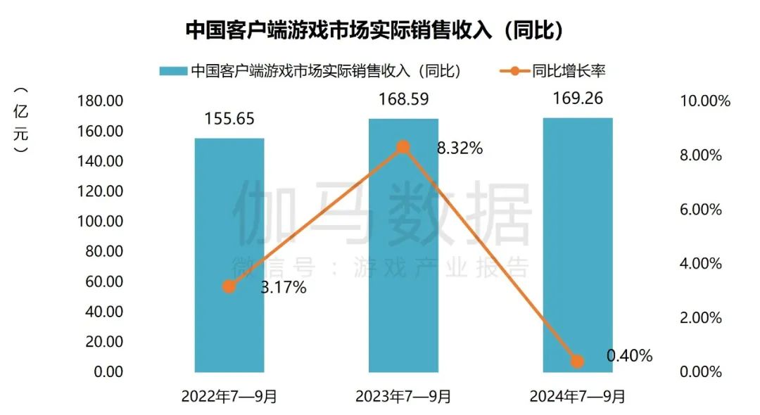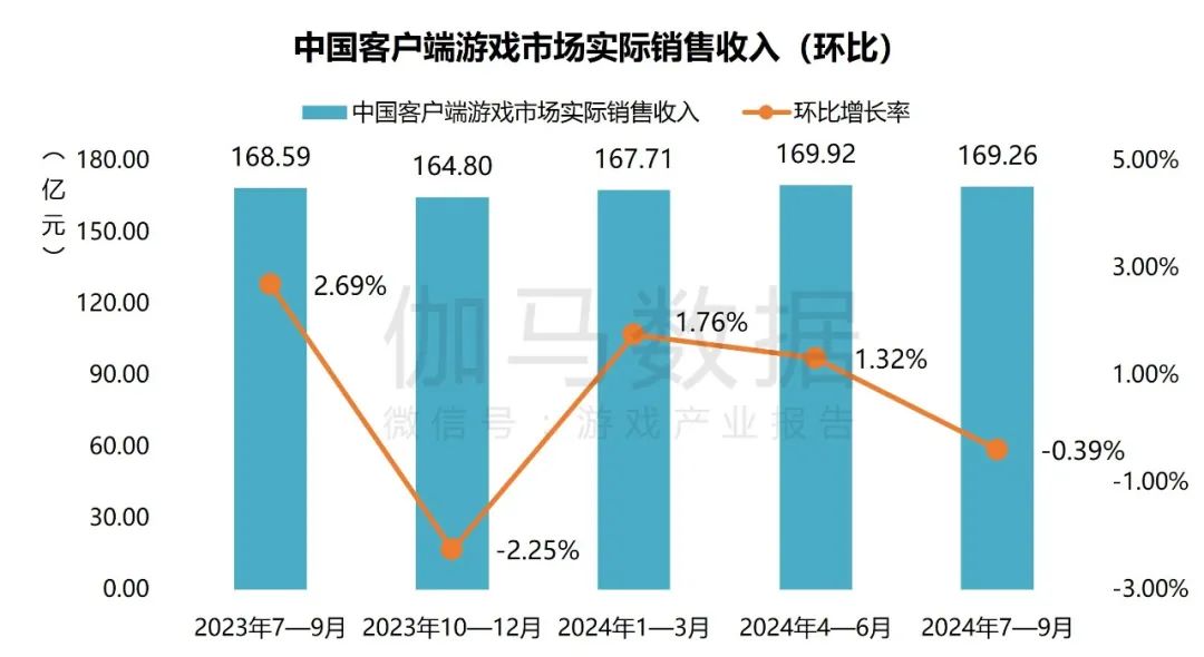 2024年7—9月客户端游戏市场规模市场规模169.26亿元市场规模变动幅度较小 同比增长0.4%