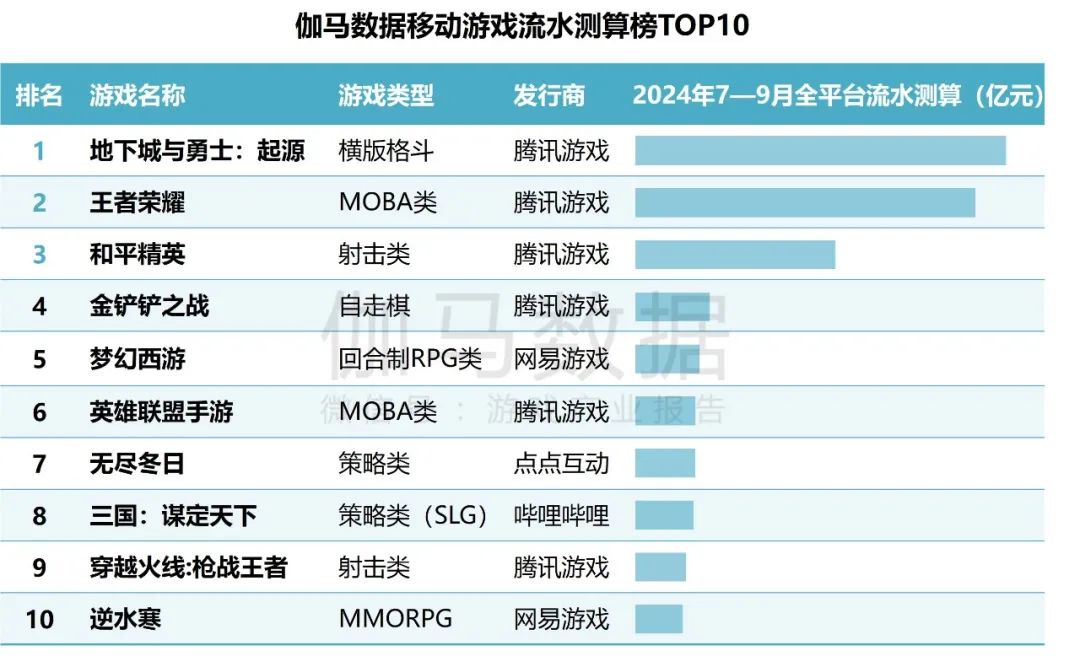 2024年7—9月,伽马数据移动游戏流水测算榜TOP10中,经典IP产品《地下城与勇士:起源》登顶,《金铲铲之战》流水同比增长显著。