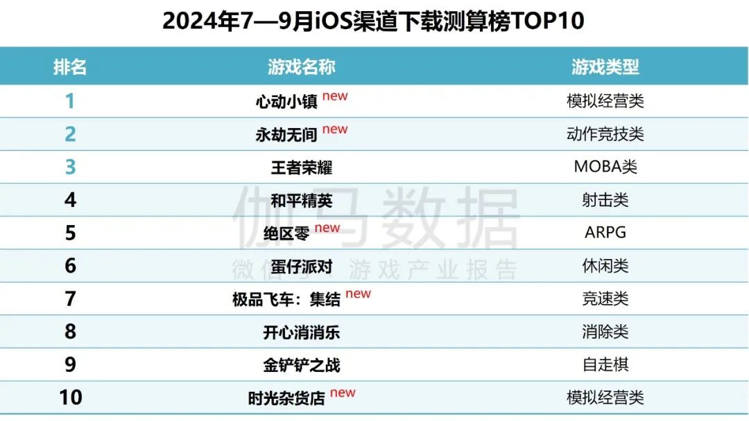 iOS渠道下载测算榜TOP10 新游《心动小镇》登顶 共五款新游入榜