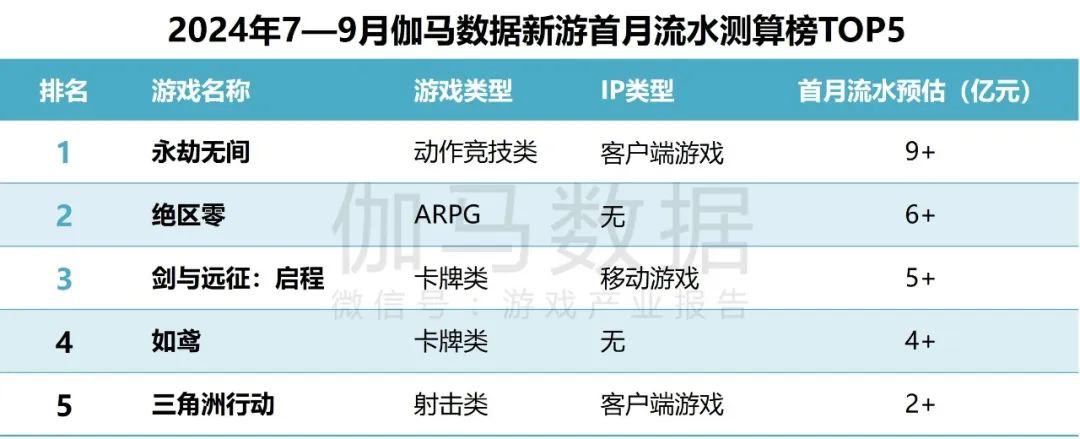 注:上述为2024年7—9月上线的移动游戏,并依据产品上线后30日国内全平台流水状况进行排名,上线不足30日的产品根据其目前流水状况推算首月流水。数据来源于伽马数据移动游戏流水测算,仅供参考。