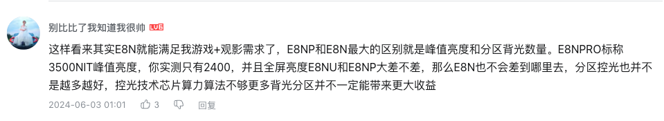 在@大声loud 这条视频下,一位用户迅速“消化”了视频里的干货,并简要输出了自己掌握的知识点,表示对比之下,E8N就能满足自己“游戏+观影”的需求。