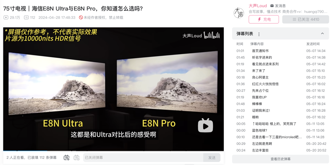 比如@大声loud,虽然粉丝数量只有4000出头,但是在对比海信E8N Ultra和E8N Pro的视频中,详细对比解释了电视峰值亮度的重要性、HRD标准中PQ量化感知技术的使用、背后使用的AI画质芯片区别等等,最终获得了29万的播放量,点赞数和收藏数也超出UP主的平均水平。