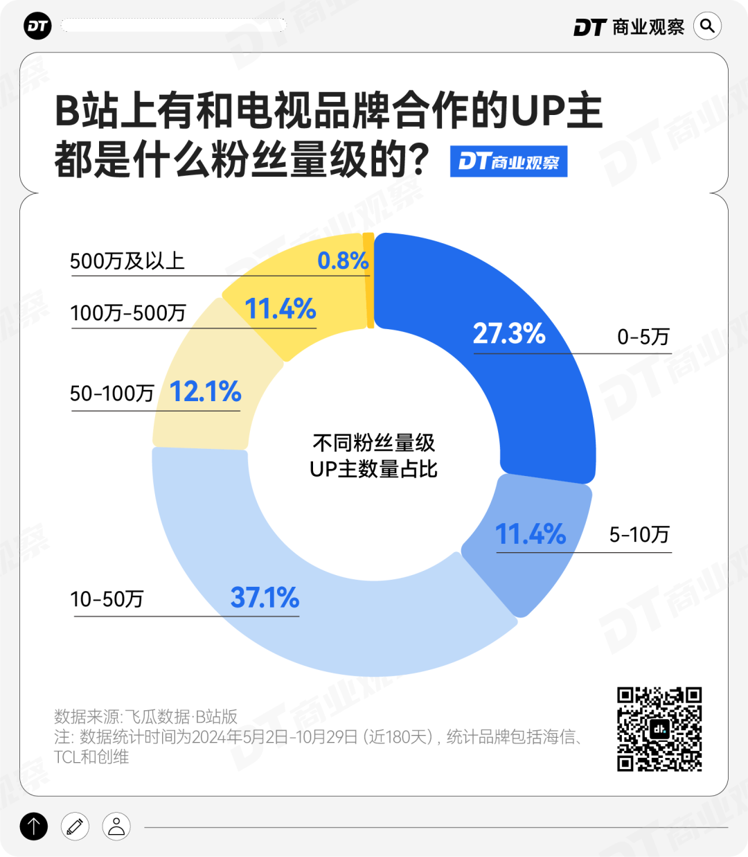 最受青睐的“恰饭”UP主,反而是粉丝数在10-50万的腰部UP主(37.1%)和粉丝数不到5万的尾部UP主(27.3%)。